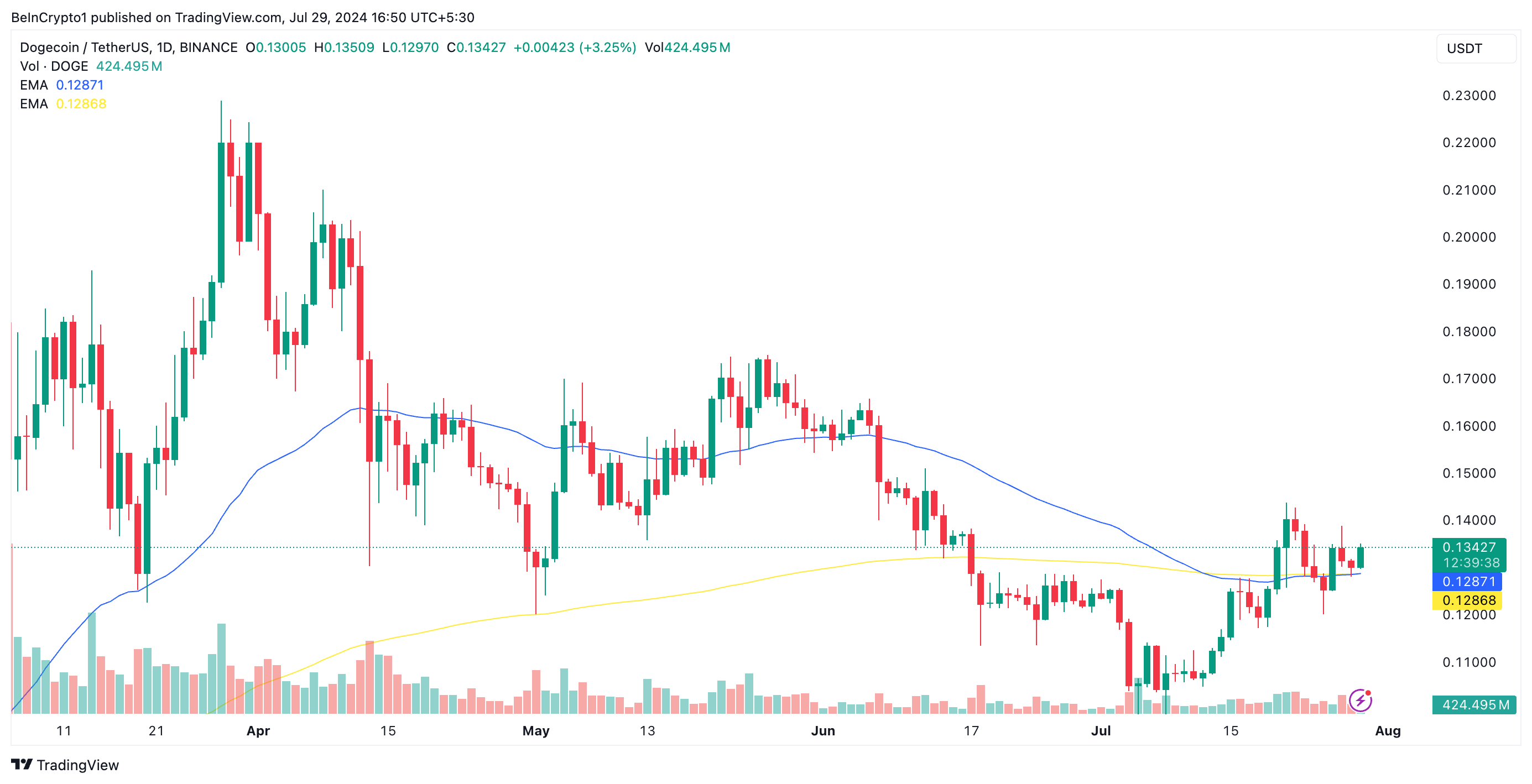في وقت النشر، يقع متوسط دوجكوين المتحرك الأسي لـ50 يومًا على متوسطها المتحرك الأسي لـ200 يوم. إذا استمر الضغط الشرائي، سيكتمل الصليب الذهبي.