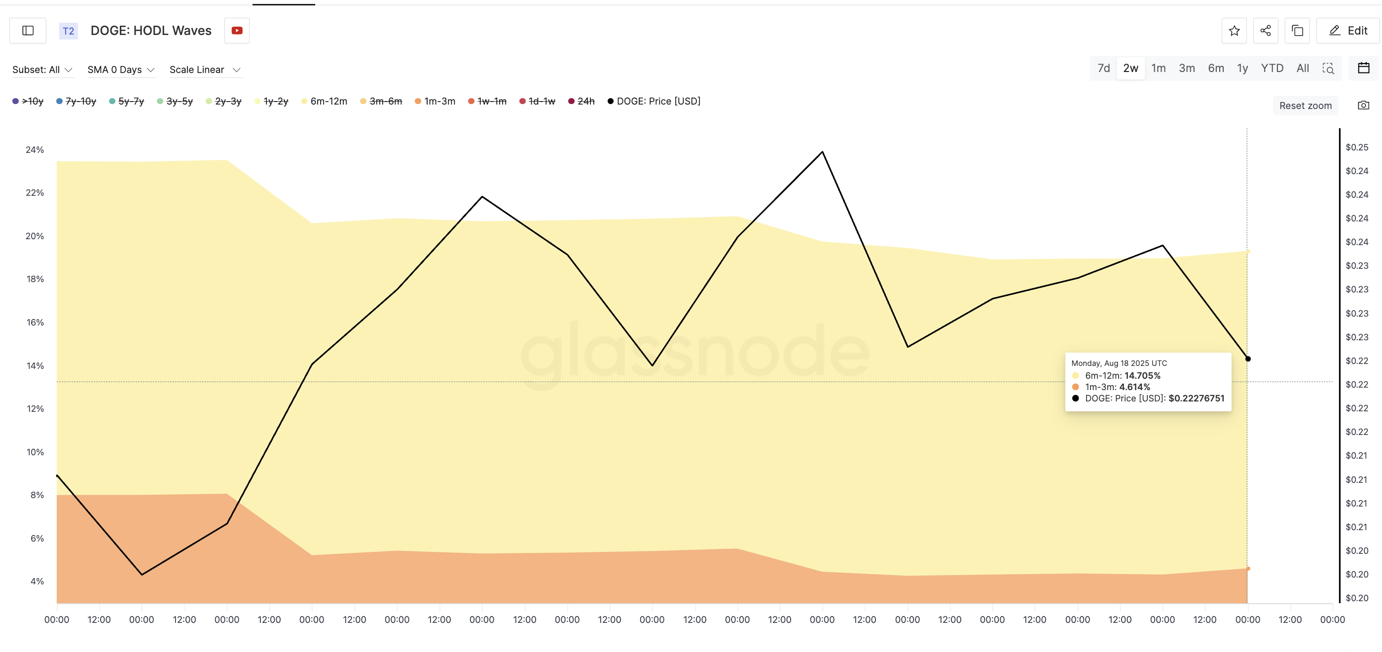 يظهر مقياس HODL Waves أن مجموعتين رئيسيتين من حاملي دوجكوين يقومون الآن بتقليص مراكزهم. هذه المجموعات هي: