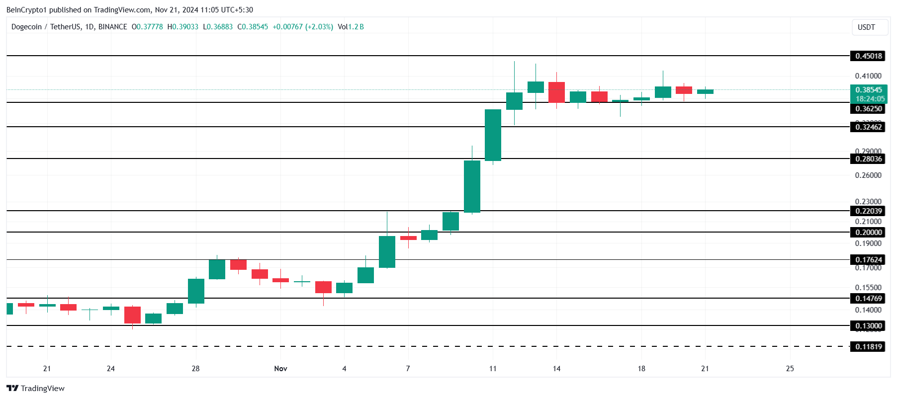 سعر عملة DOGE حاليًا ثابت فوق مستوى الدعم 0.36 دولار للحفاظ على ارتفاعه، يجب على DOGE اختراق وتأمين 0.45 دولار كأرضية دعم. تحقيق هذا الإنجاز يمكن أن يمهد الطريق لمكاسب إضافية، مما قد يدفع السعر إلى الأعلى.