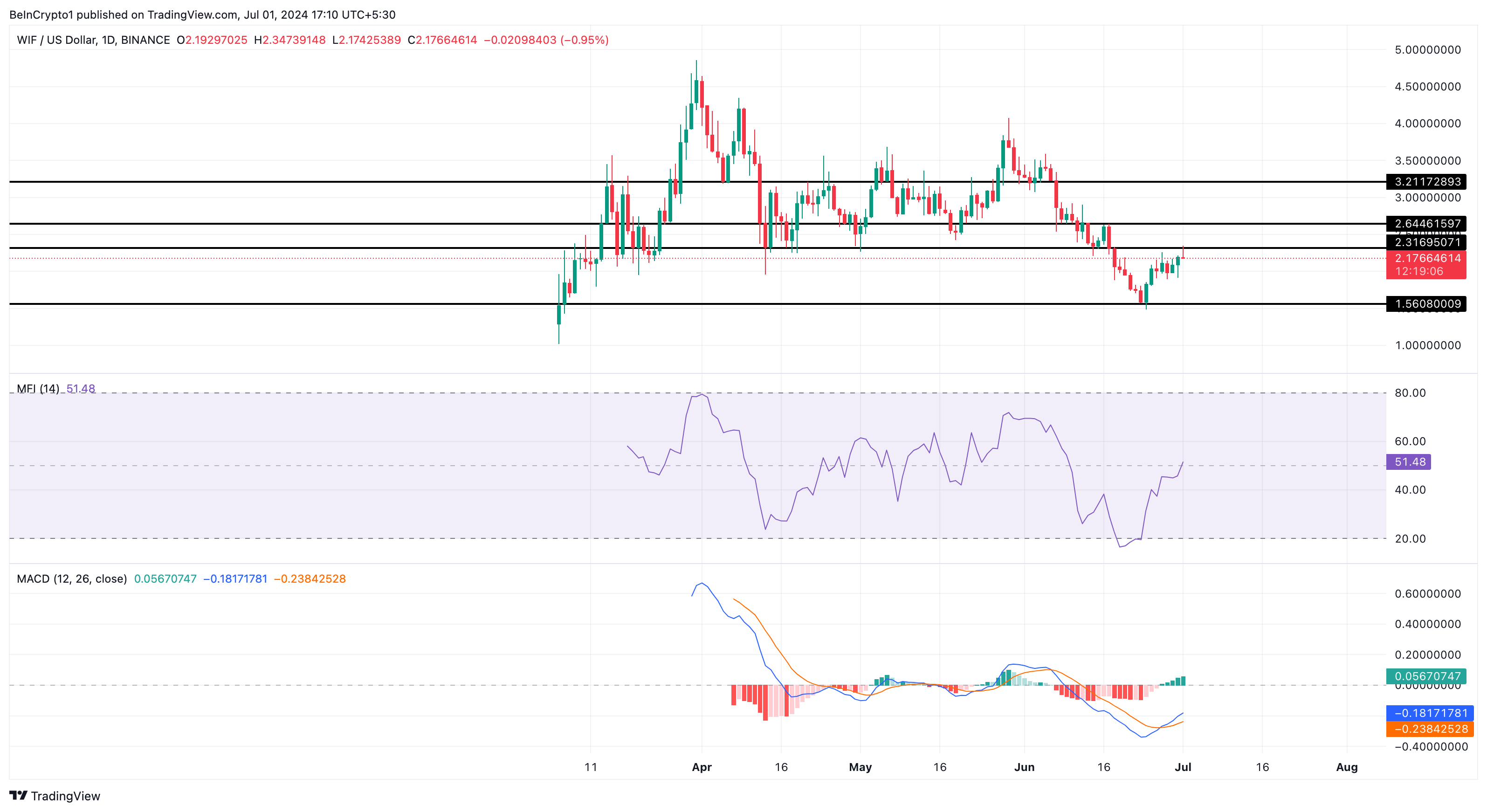 في الرسم البياني اليومي، لاحظت BeInCrypto أن استنفاد البائعين في 23 يونيو كان حاسمًا لارتداد WIF. خلال تلك الفترة، تم تداول السعر بـ 1,56 دولار. فيما بعد، لاحظ الثيران الإرهاق، مما ساعد عملة الميم على تشكيل شمعة خضراء يومية شبه مثالية.