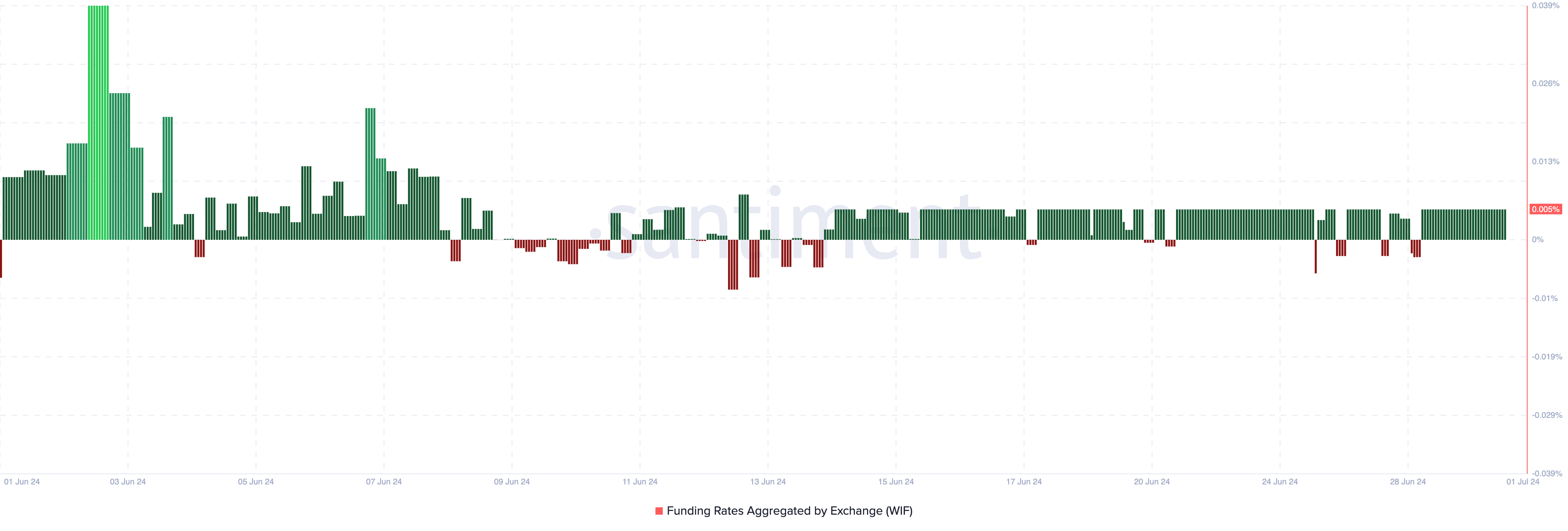 في وقت كتابة هذا التقرير، يبلغ معدل تمويل Dogwifhat 0,005%. يساعد معدل التمويل في الحفاظ على توازن السوق. هذا لضمان عدم انتهاء صلاحية العقود. إذا كان إيجابيًا، يدفع المشترون (الطويلون) للبائعين (القصيرون).