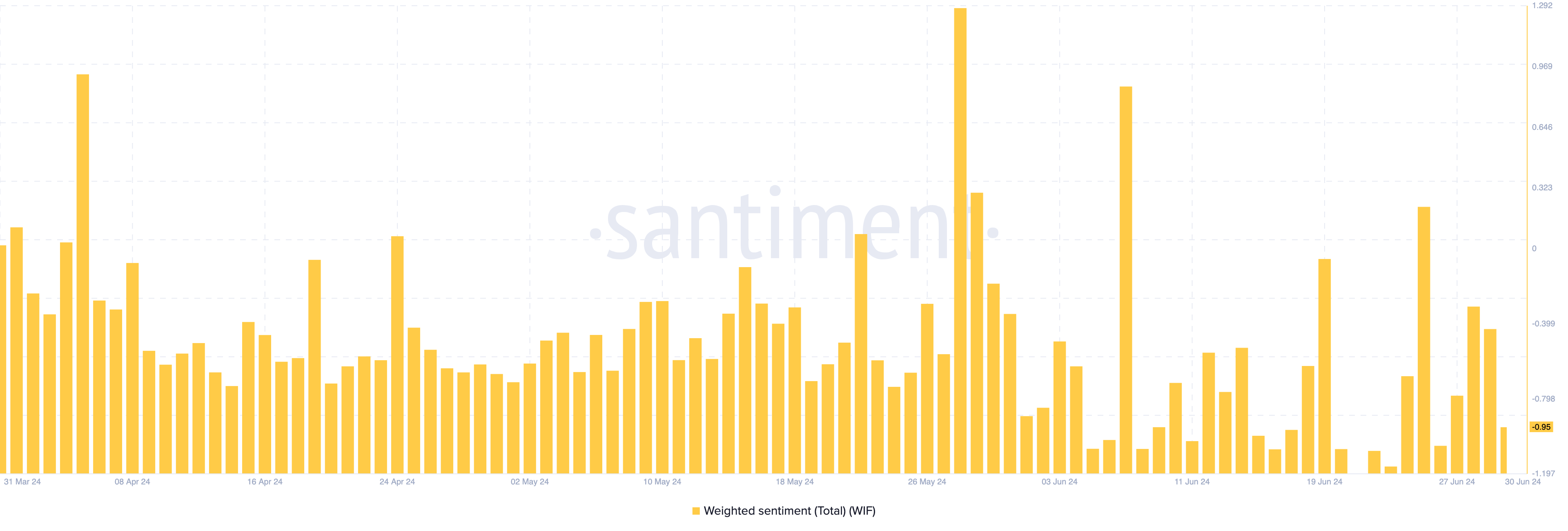 وفقًا لسانتيمنت، يظل المشاعر الموزونة لـ Dogwifhat عند -0,95. يأخذ المشاعر الموزونة في الاعتبار عدد المرات التي يُذكر فيها الأصل مع تتبع تلك التي تُعبر عنها بطريقة إيجابية أو سلبية.