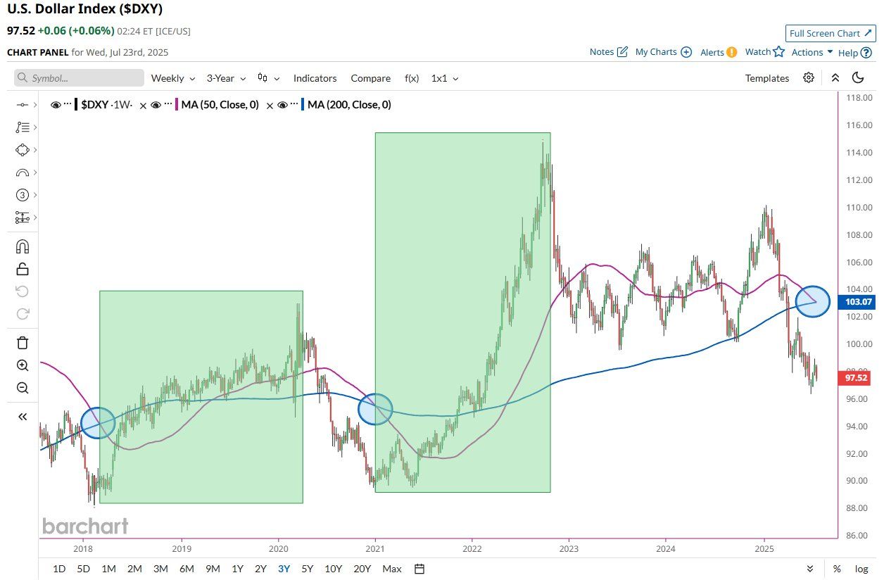 ومع ذلك، أشارت Barchart إلى أن آخر مرتين حدث فيهما هذا (2018 و2021)، كان ذلك علامة على قاع السوق. لذلك، بينما الإشارة هبوطية، تشير الاتجاهات التاريخية إلى أنها قد تشير إلى ارتداد محتمل للدولار.
