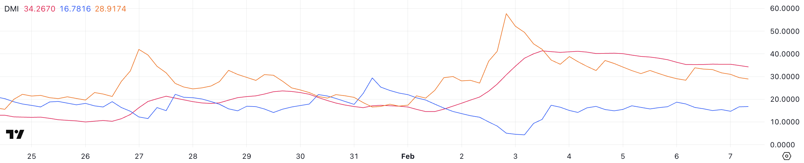 يظهر مخطط مؤشر الحركة الاتجاهية (DMI) لإيثريوم أن مؤشر الاتجاه المتوسط (ADX) حاليًا عند ٣٤,٢، منخفضًا من ٤٠ قبل يومين فقط. يقيس ADX قوة الاتجاه، حيث تشير القيم فوق ٢٥ عمومًا إلى اتجاه قوي والقيم تحت ٢٠ تشير إلى حركة سعر ضعيفة أو محصورة في نطاق.