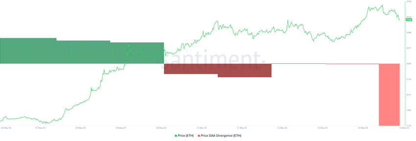 تشير هذه القيمة السلبية إلى أن الزيادة المقابلة في تفاعل المستخدمين لا تدعم مكاسب السعر الأخيرة لـ ETH. في الأساس، لا يوجد طلب كافٍ يدفع ارتفاع ETH، وبالتالي فإنه يواجه خطر التراجع في المدى القريب.