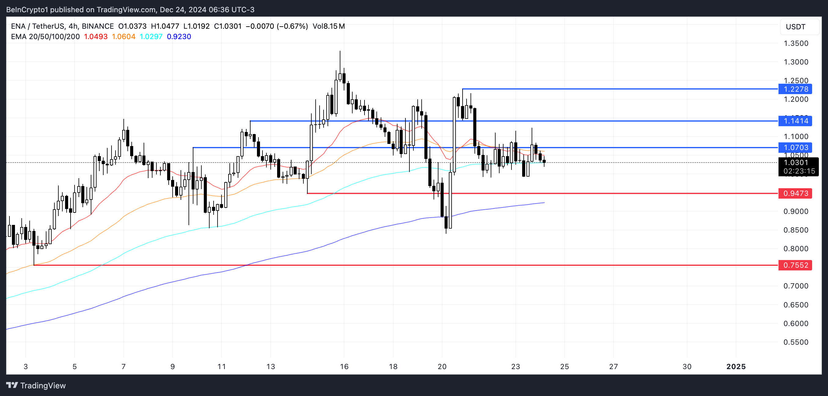 على العكس، إذا فشل الدعم عند $0,94 في الصمود، فقد يواجه سعر ENA انخفاضًا حادًا، مع احتمال انخفاض السعر إلى $0,75—مخاطرة هبوط بنسبة 27%. يظهر هذا أهمية النطاق الحالي، حيث من المحتمل أن يحدد اختراق أي من المستويين مسار سعر ENA على المدى القصير.