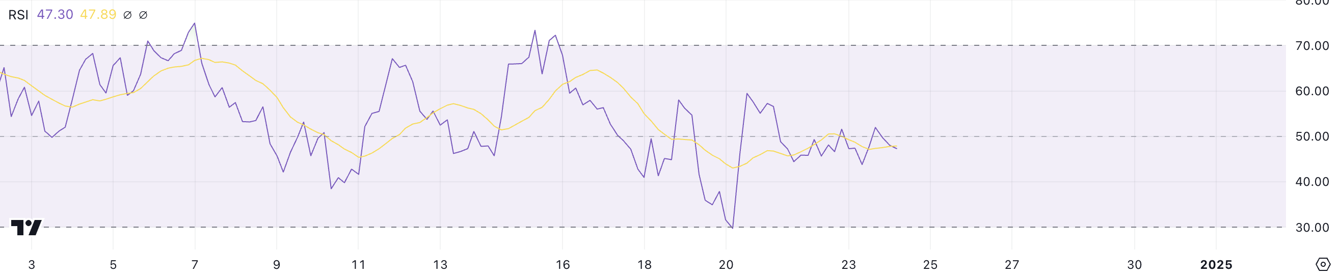 مؤشر القوة النسبية (RSI) لـ ENA حاليًا عند 47,3، مما يعكس حالة محايدة منذ 21 ديسمبر. تشير قيم RSI في هذا النطاق إلى أن لا المشترين ولا البائعين يسيطرون بوضوح على السوق، مع إظهار الرمز زخم تداول متوازن.