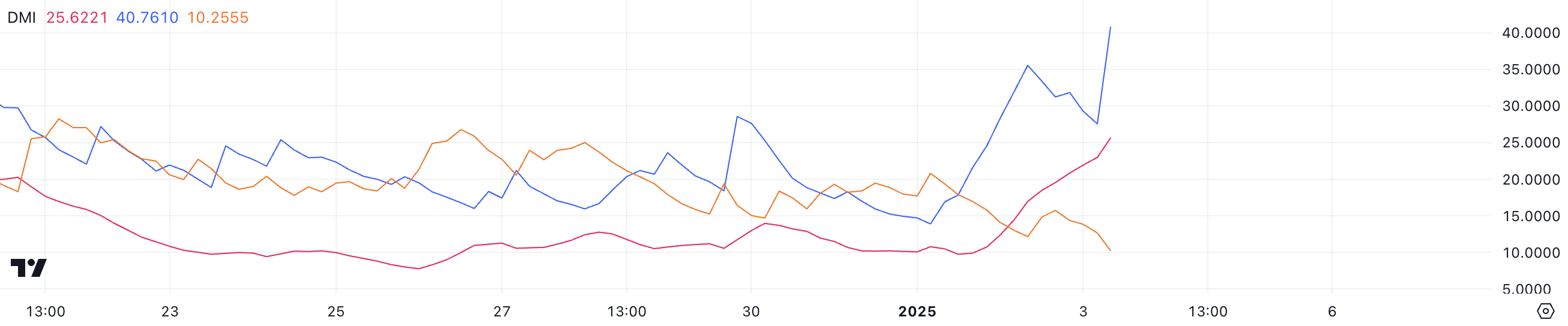 يكشف مخطط DMI لـ إيثينا أن ADX قد ارتفع إلى 25,6، وهو زيادة كبيرة من 9,9 قبل يومين فقط، مما يشير إلى ارتفاع قوي في قوة الاتجاه. يقيس ADX، أو مؤشر الاتجاه المتوسط، قوة الاتجاه على مقياس من 0 إلى 100.