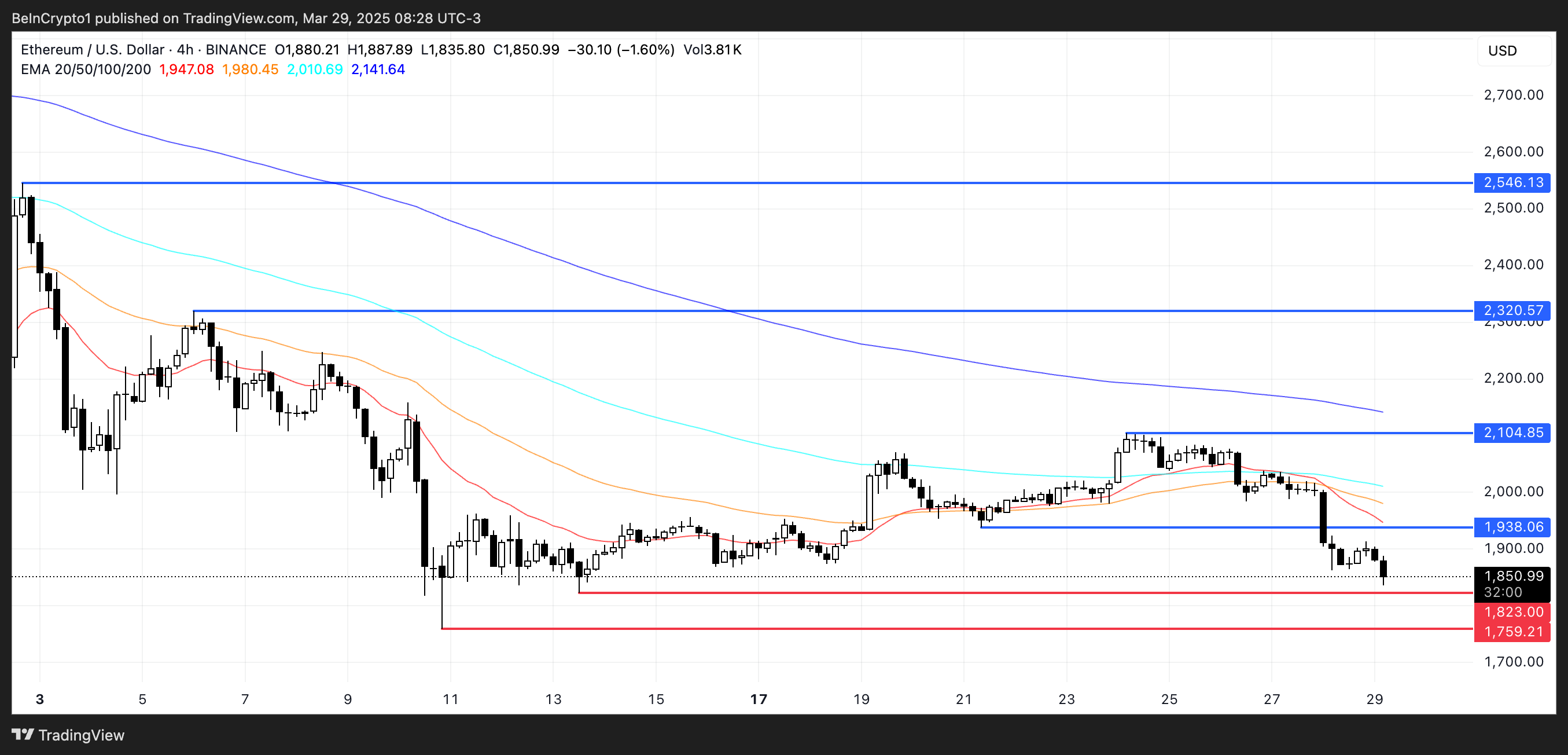 ومع ذلك، إذا تغيرت المعنويات وانعكس الاتجاه، يمكن أن يستعيد إيثريوم الأرض ويختبر مستوى المقاومة عند $1,938.