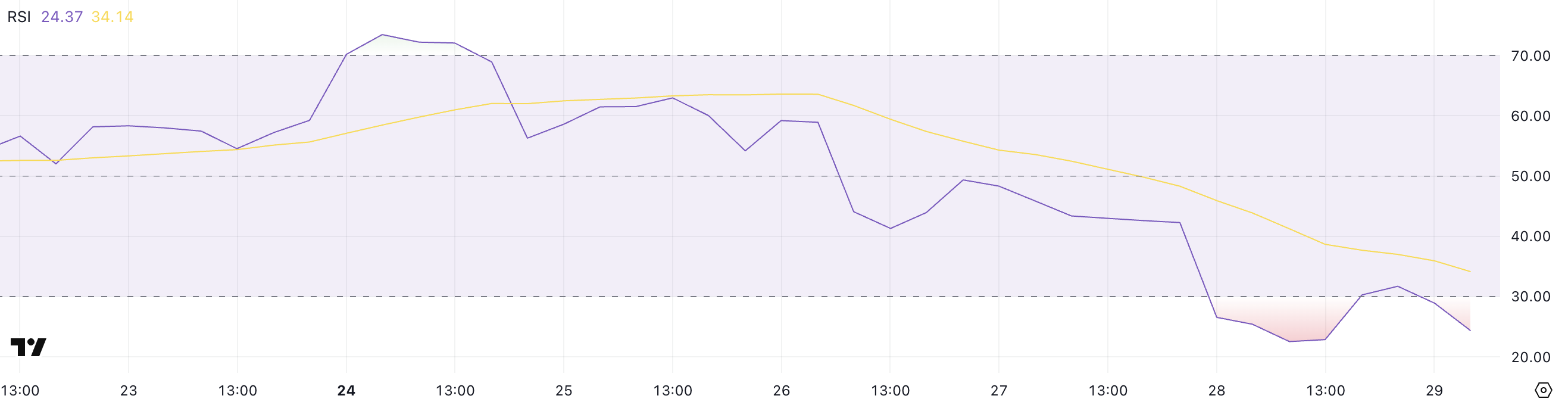 انخفاض سعر إيثريوم الأخير دفع مؤشر القوة النسبية (RSI) إلى منطقة البيع المفرط، حيث يجلس حاليًا عند ٢٤,٣٧. قبل ثلاثة أيام فقط، كان مؤشر القوة النسبية عند ٥٨,٩٢، مما يشير إلى مدى سرعة تغير الشعور.