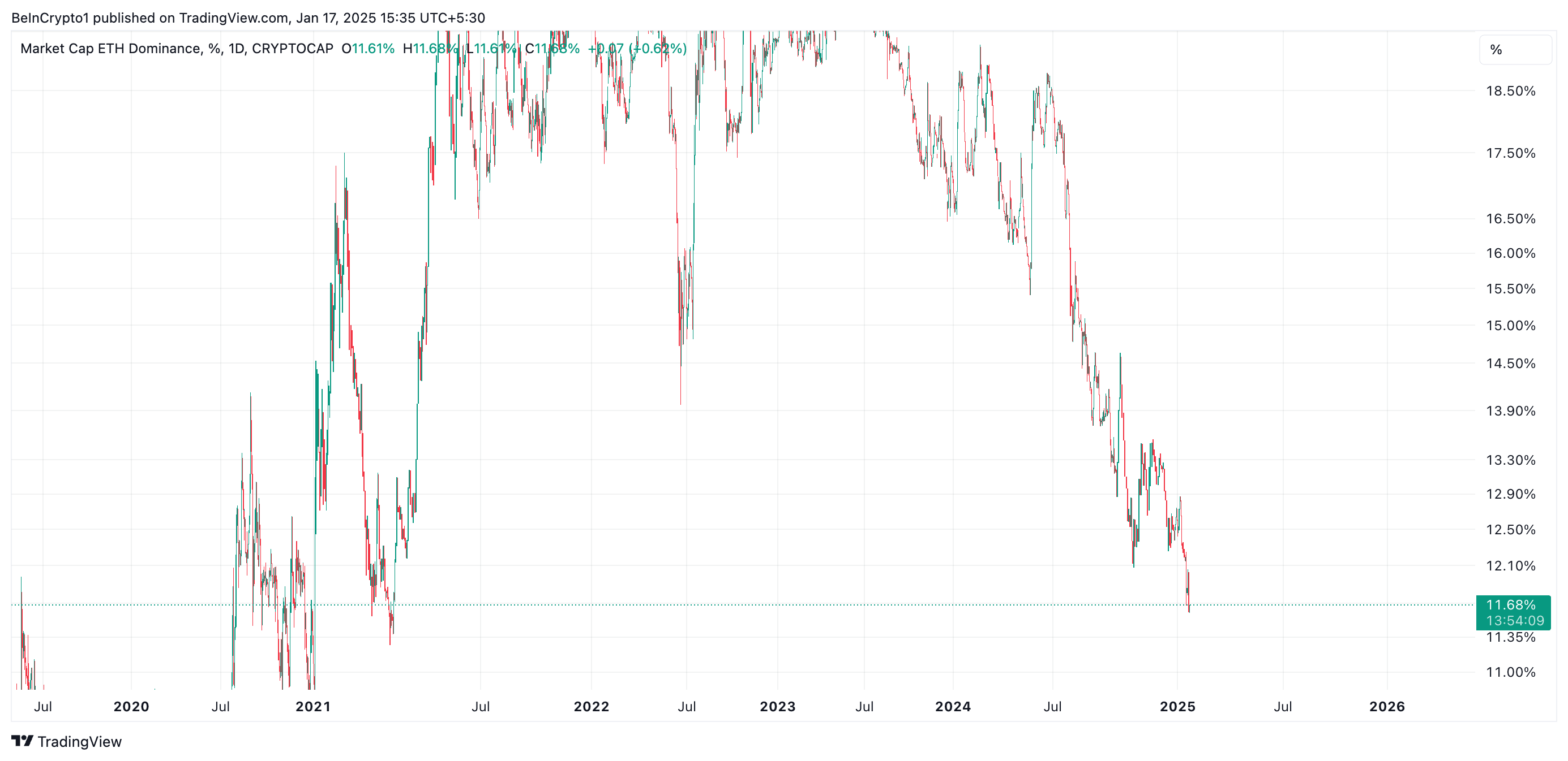 هيمنة إيثريوم (ETH.D)، التي تتبع القيمة النسبية لـ ETH مقارنة بالعملات الرقمية الأخرى، كانت في اتجاه هبوطي منذ بداية العام. وهي الآن عند أدنى مستوى لها منذ أربع سنوات بنسبة ١١٬٦٨٪، بعد أن انخفضت بنسبة ٦٪ منذ ١ يناير.