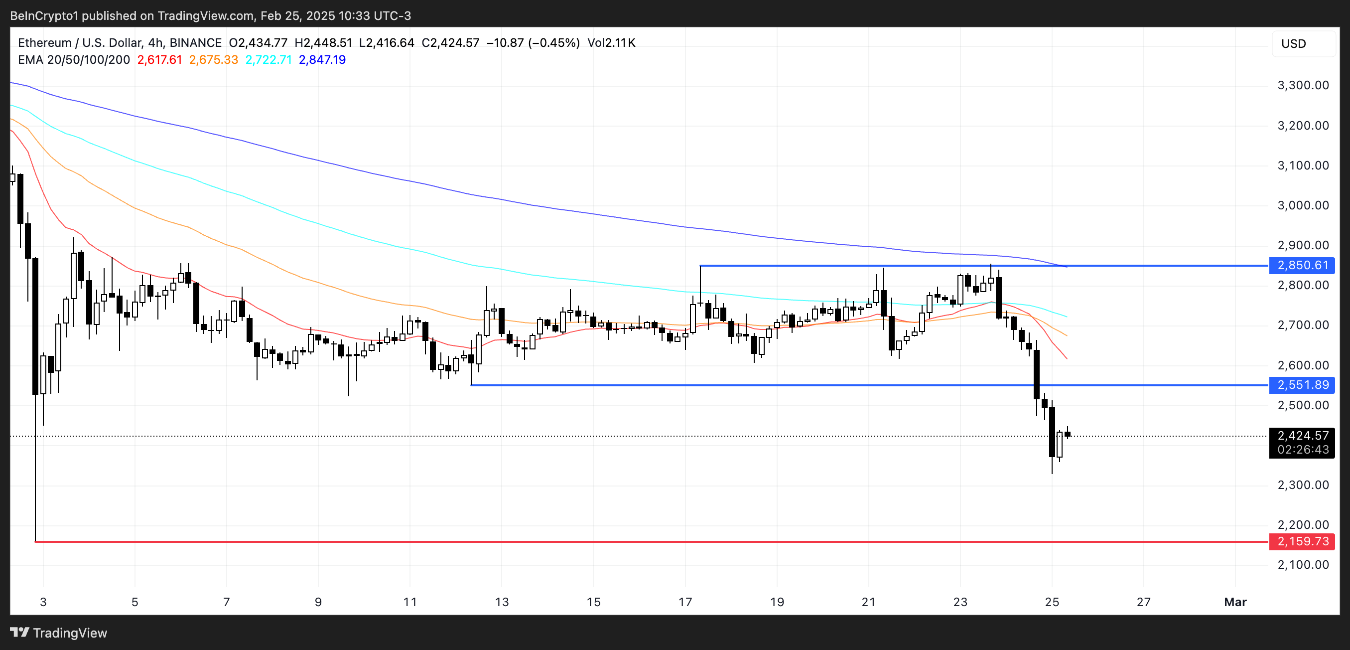 بعد هذا النمط، انخفض سعر إيثريوم إلى أقل من ٢٬٥٠٠$، مما يعكس زيادة ضغط البيع. إذا استمر هذا الاتجاه الهبوطي، فقد ينخفض ETH أكثر إلى ٢٬١٥٩$، ليهبط إلى أقل من ٢٬٢٠٠$ لأول مرة منذ ديسمبر ٢٠٢٣. يشير هذا التقاطع إلى أن الزخم الهبوطي يهيمن، ويفضل توخي الحذر حيث يمكن أن يستمر الضغط الهبوطي.