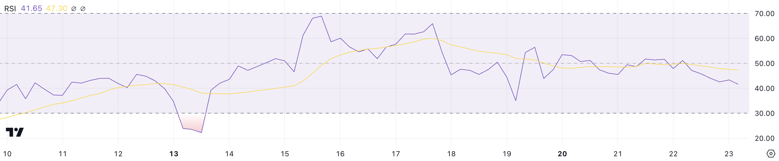 RSI هو مذبذب زخم يقيس سرعة وحجم تغيرات الأسعار، عادة باستخدام فترة 14 يومًا. يعمل المؤشر على مقياس من 0 إلى 100، مع قراءات فوق 70 تعتبر عادةً شراء مفرط وتحت 30 بيع مفرط. مع RSI الحالي لـETH عند 41,6، يظهر الأصل زخمًا هبوطيًا طفيفًا لكنه يبقى في منطقة محايدة.