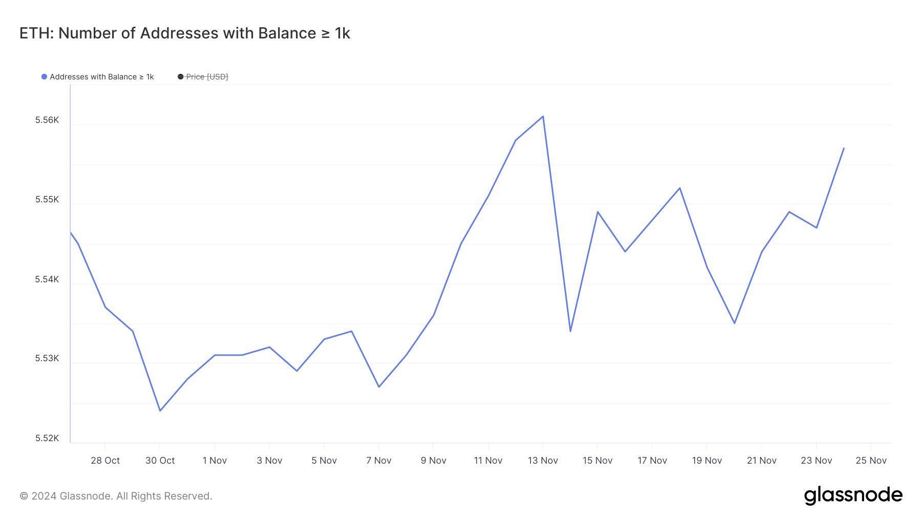 بعد الارتفاع من 5٬527 إلى 5٬561 خلال ستة أيام، انخفض عدد الحيتان إلى 5٬535 في 20 نوفمبر، مما يشير إلى فترة قصيرة من جني الأرباح أو تقليل التراكم. ومع ذلك، فإن الانتعاش الأخير إلى 5٬557 خلال أسبوع يعكس تجدد الاهتمام والتراكم بين الحائزين الكبار.