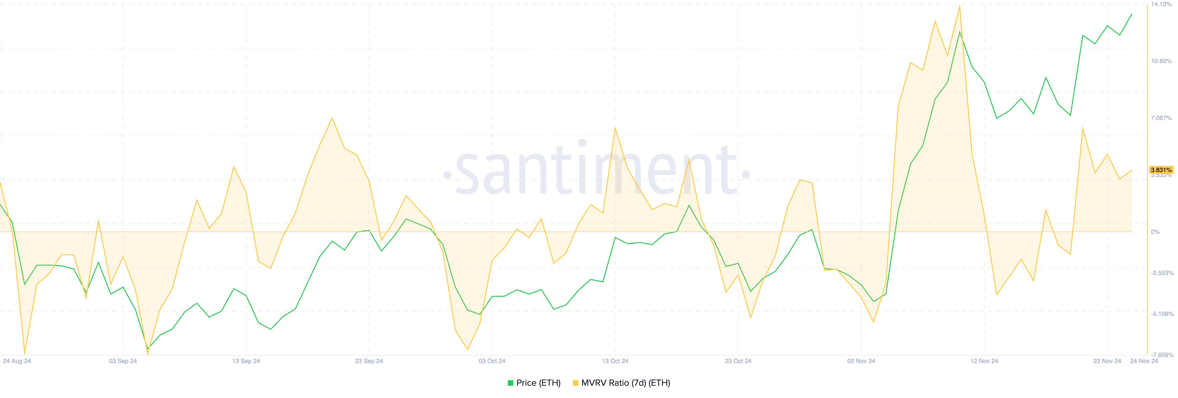 إذا تجاوز MVRV لمدة 7 أيام عتبة 7% مرة أخرى، فقد يشهد سعر ETH مكاسب كبيرة، قد تتجاوز 10%، مع بناء الشعور الصعودي ومقاومة المتداولين لجني الأرباح توقعًا لمزيد من الارتفاع.