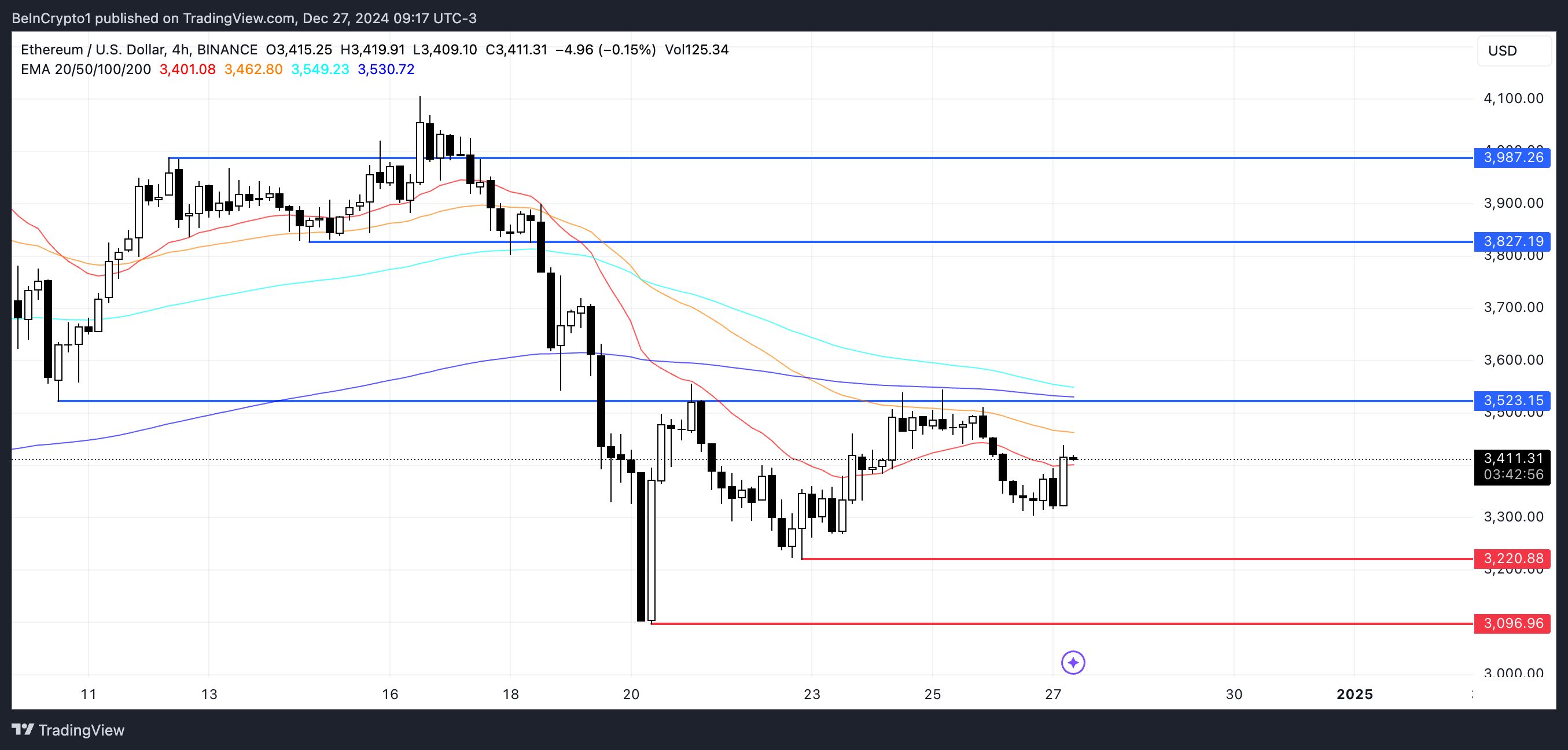 يتداول سعر إيثريوم حاليًا ضمن نطاق، مع مقاومة عند $3,523 ودعم عند $3,220. تشير خطوط EMA إلى اتجاه هبوطي، حيث تقع المتوسطات قصيرة الأجل أسفل المتوسطات طويلة الأجل.