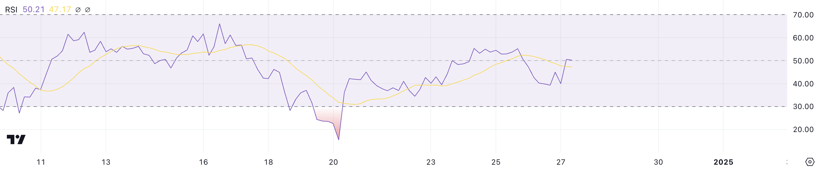 إيثريوم مؤشر القوة النسبية (RSI) حاليًا عند ٥٠,٢١، ويبقى في المنطقة المحايدة حيث تذبذب بين ٣٥ و٥٥ منذ ٢٠ ديسمبر.