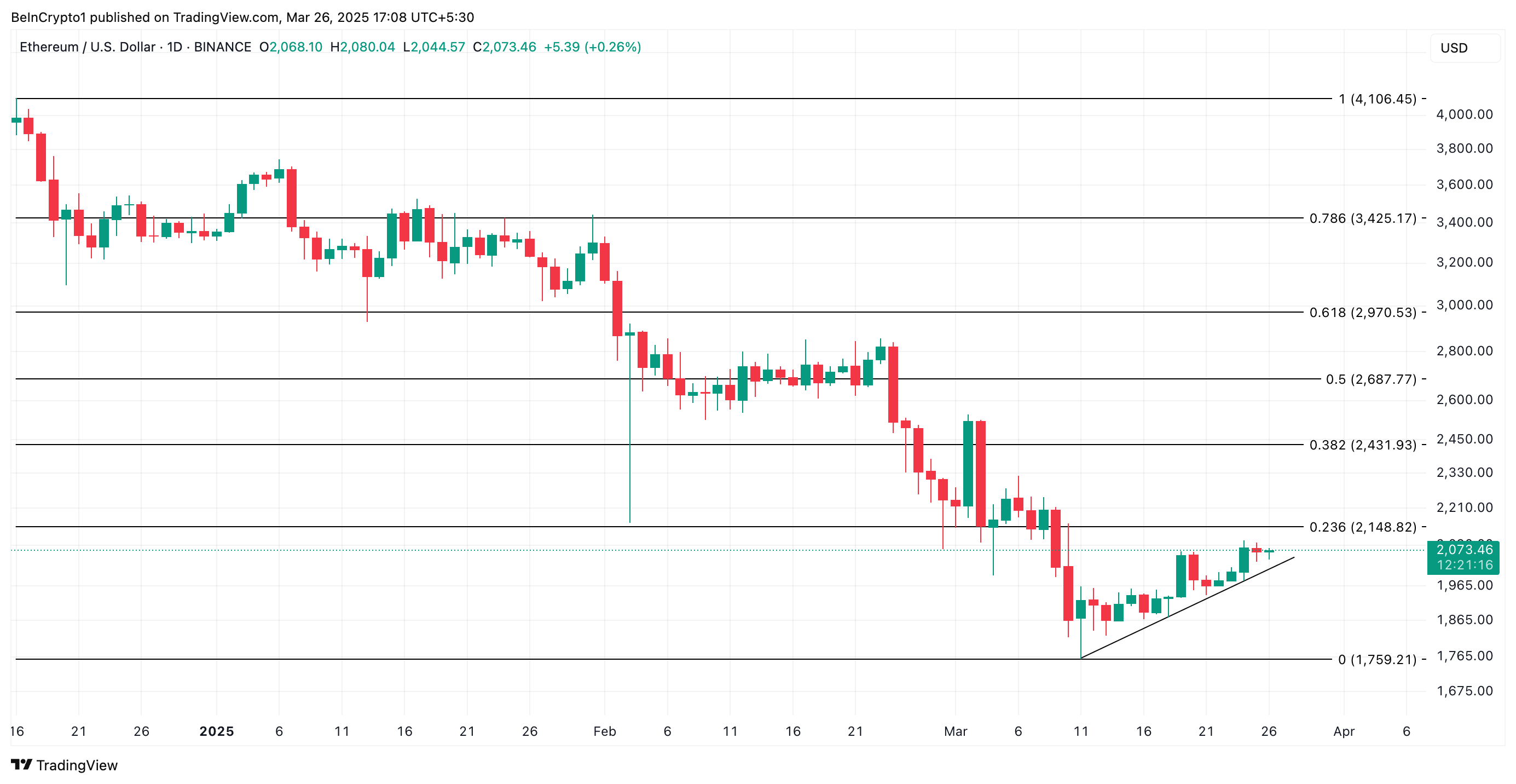 في وقت النشر، يتم تداول ETH عند $2,073، مسجلًا زيادة بنسبة 3% خلال الأسبوع الماضي كجزء من تعافي السوق الأوسع.