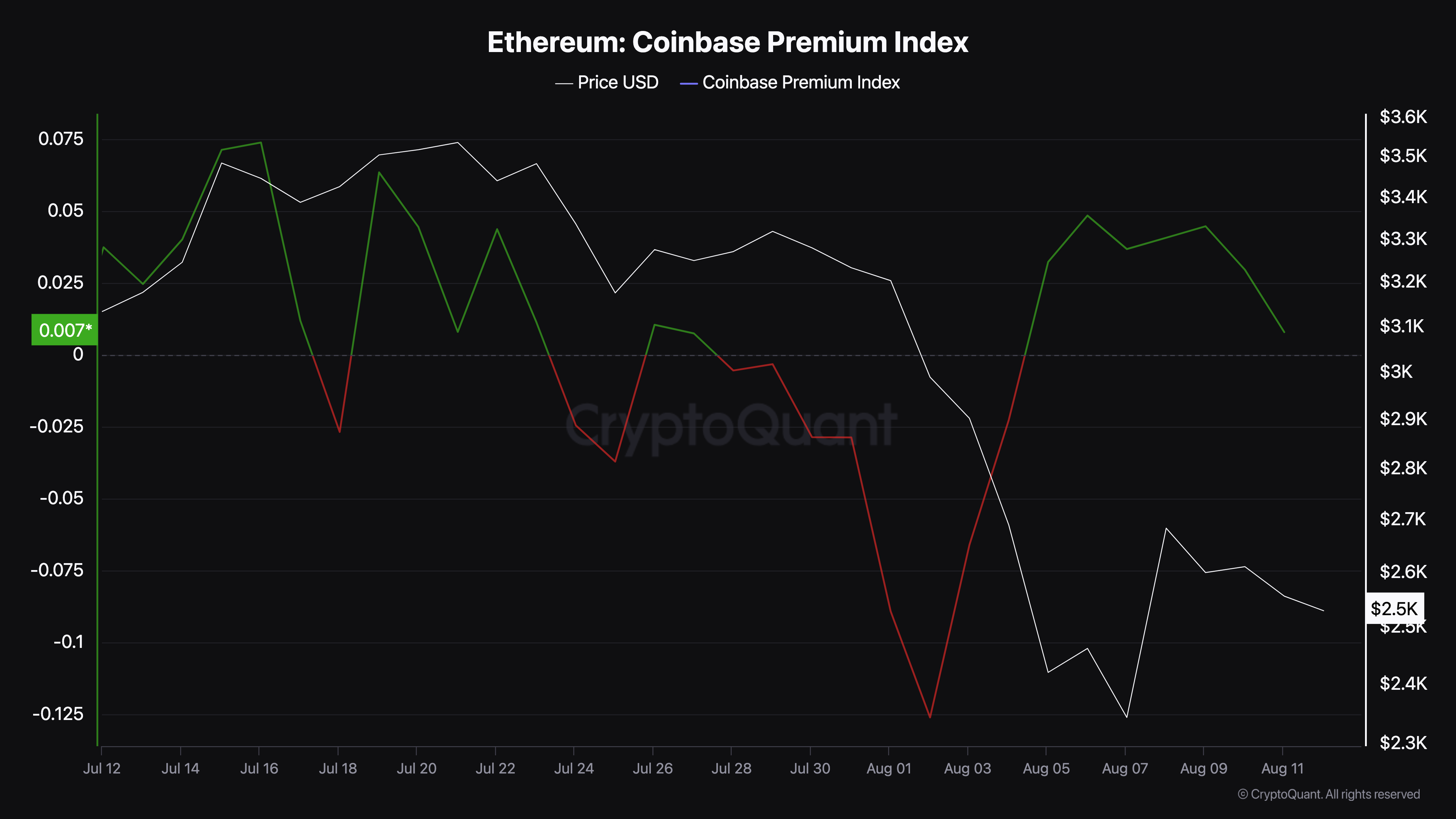 وفقاً لCryptoQuant، ارتفع مؤشر Coinbase Premium لإيثيريوم بين 3 و6 أغسطس. يوفر هذا المؤشر رؤى حول نشاط المشاركين في السوق في الولايات المتحدة. تشير القيم العالية إلى ضغط شرائي قوي في البلاد.