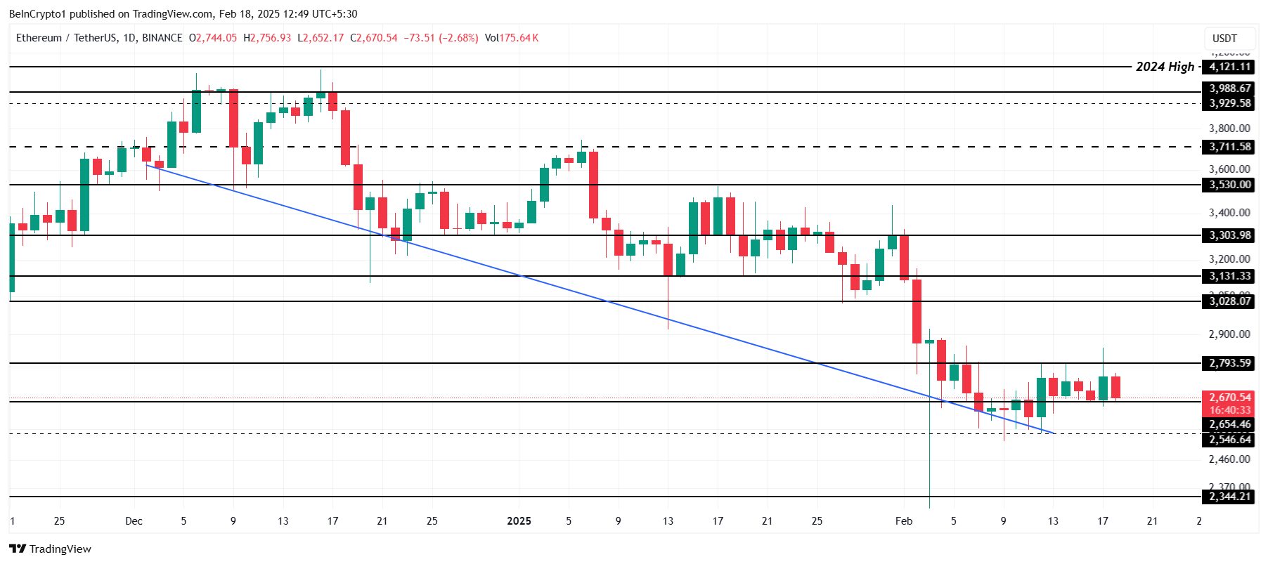 حاليًا يتم تداول إيثريوم عند 2,670$، محافظًا على الثبات فوق مستوى الدعم 2,654$. يعمل العملة البديلة على اختراق المقاومة التالية عند 2,793$، مما سيمهد الطريق لحركة صعودية نحو علامة 3,028$. يمثل هذا المستوى السعري عقبة رئيسية يجب على ETH التغلب عليها في رحلتها نحو 3,000$.