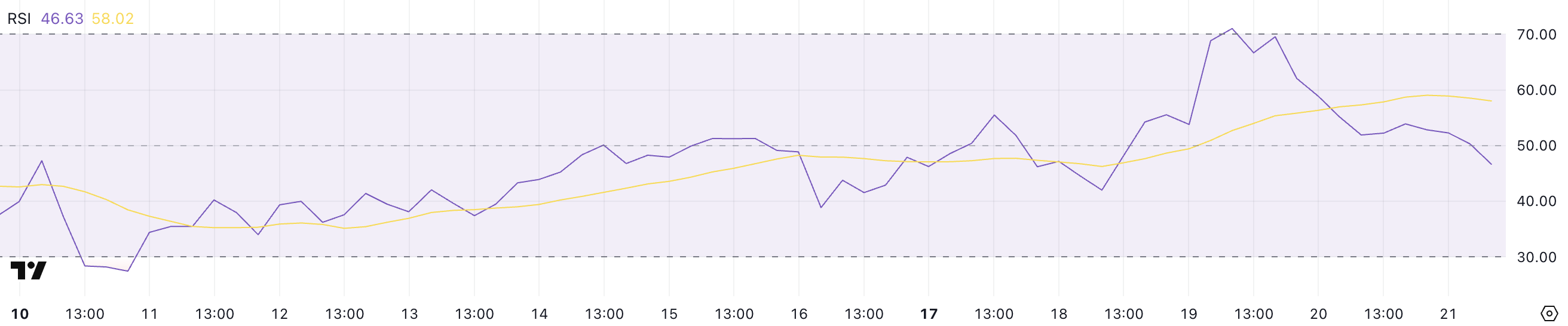 انخفض RSI لإيثريوم بشكل حاد إلى 46,63 من 71 قبل يومين فقط، مما يشير إلى تحول في الزخم.