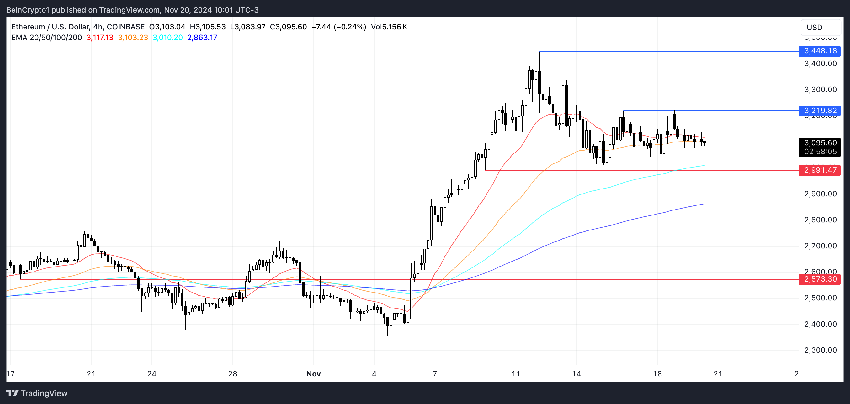 من ناحية أخرى، قد يدفع تجدد الثقة من الحيتان سعر ETH إلى الأعلى. في هذا السيناريو، قد يختبر السعر أولاً المقاومة عند $3,219 ثم يرتفع إلى $3,448، مما يوفر إمكانية صعود حوالي 15%.