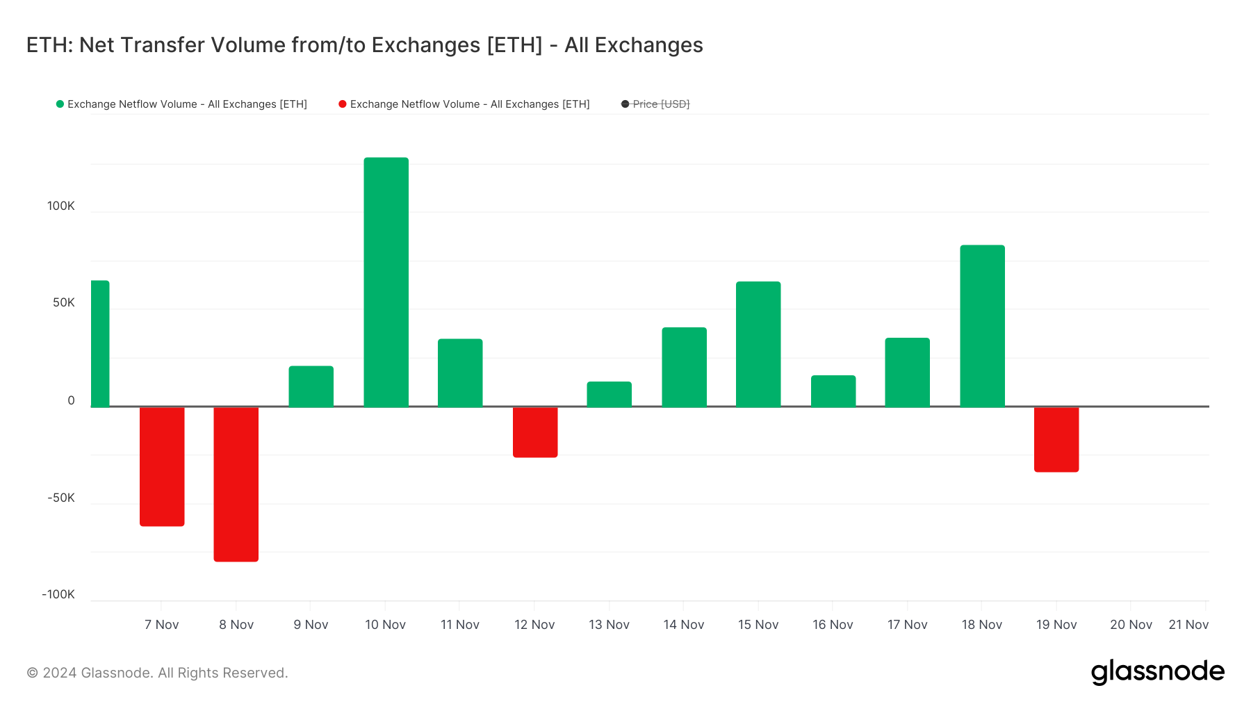 تدفق إيثريوم الصافي من/إلى البورصات أظهر تقلبات ملحوظة في الأسابيع الأخيرة. بين ١٣ نوفمبر و١٨ نوفمبر، كان التدفق الصافي إيجابيًا باستمرار، وبلغ ذروته عند ٨٣٬٥٠٠ في ١٨ نوفمبر.