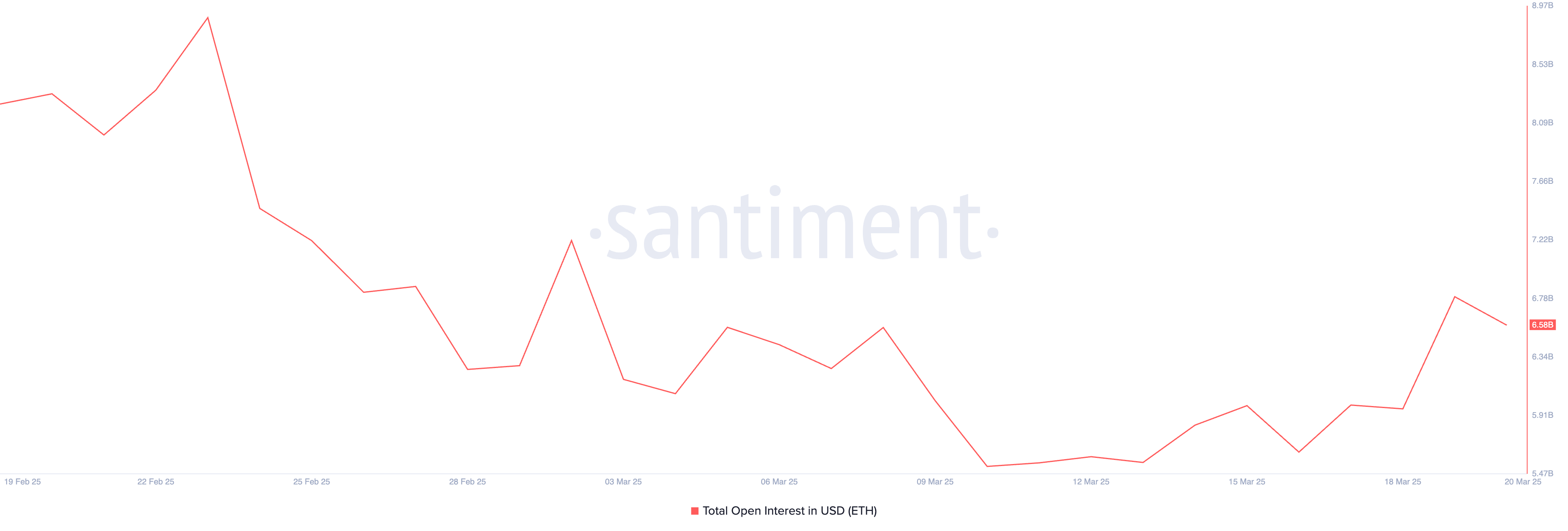 علاوة على ذلك، يعكس الانخفاض في الفائدة المفتوحة (OI) للعملة تراجع الطلب. في وقت النشر، كانت هذه الفائدة عند $6٬58 مليار، بانخفاض 20% خلال الشهر الماضي.