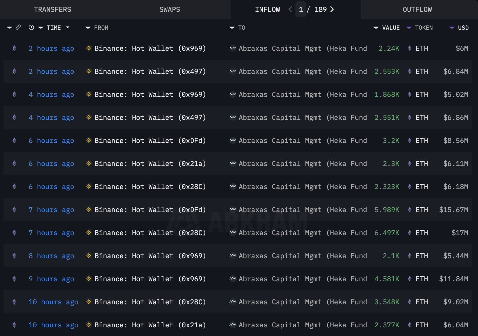 Sponsoredتظهر البيانات من أركهام إنتليجنس أن المحافظ التابعة لصناديق أبراكساس كابيتال هيكا سحبت ETH من عدة بورصات رئيسية، وخصوصًا بينانس. تراوحت المعاملات بين 2,100 و6,497 ETH لكل عملية، مما يعادل قيمًا بين 5,44 مليون دولار و17 مليون دولار. تسلط 189 معاملة في 10 ساعات الضوء على استراتيجية التراكم العدوانية للمنظمة.
