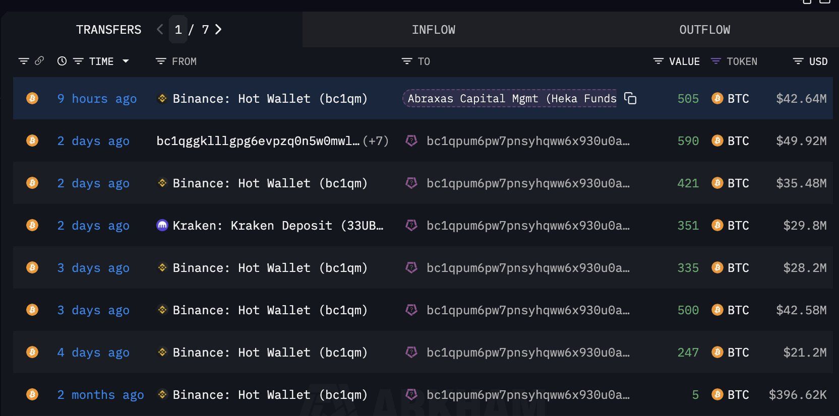 نقطة أخرى ملحوظة هي تحول أبراكساس من بيتكوين (BTC) إلى ETH. أفاد Lookonchain أن محفظة مرتبطة بـ المنظمة سحبت 2,949 BTC، ما يعادل 250 مليون دولار، من عدة بورصات.