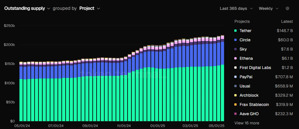 تدرج CoinMarketCap أكثر من 200 عملة مستقرة، بينما يتتبع CoinGecko أكثر من 300. البيانات من Token Terminal تظهر أن القيمة السوقية للعملات المستقرة قد تجاوزت 225 مليار دولار، صادرة عن أكثر من 50 كيانًا. ومع ذلك، لا تزال Tether وCircle تهيمنان على معظم تلك القيمة السوقية.