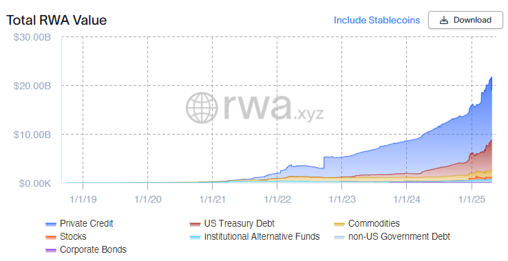 أفاد BeInCrypto أن القيمة السوقية لـ RWAs تجاوزت 20 مليار دولار في أبريل. في وقت كتابة هذا التقرير، تُظهر منصة RWA.xyz أن القيمة السوقية الحالية تبلغ 18,9 مليار دولار.