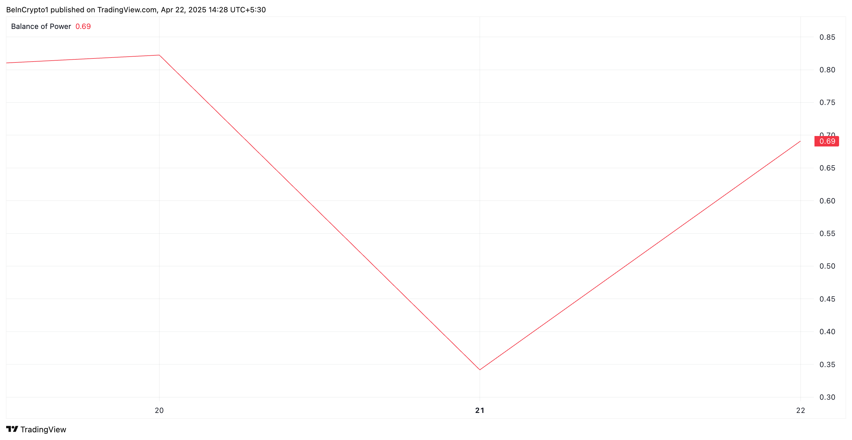 يقيس مؤشر BoP قوة المشترين مقابل البائعين في السوق. عندما تكون قيمته إيجابية، يهيمن المشترون ويمارسون ضغطًا أكبر من البائعين.