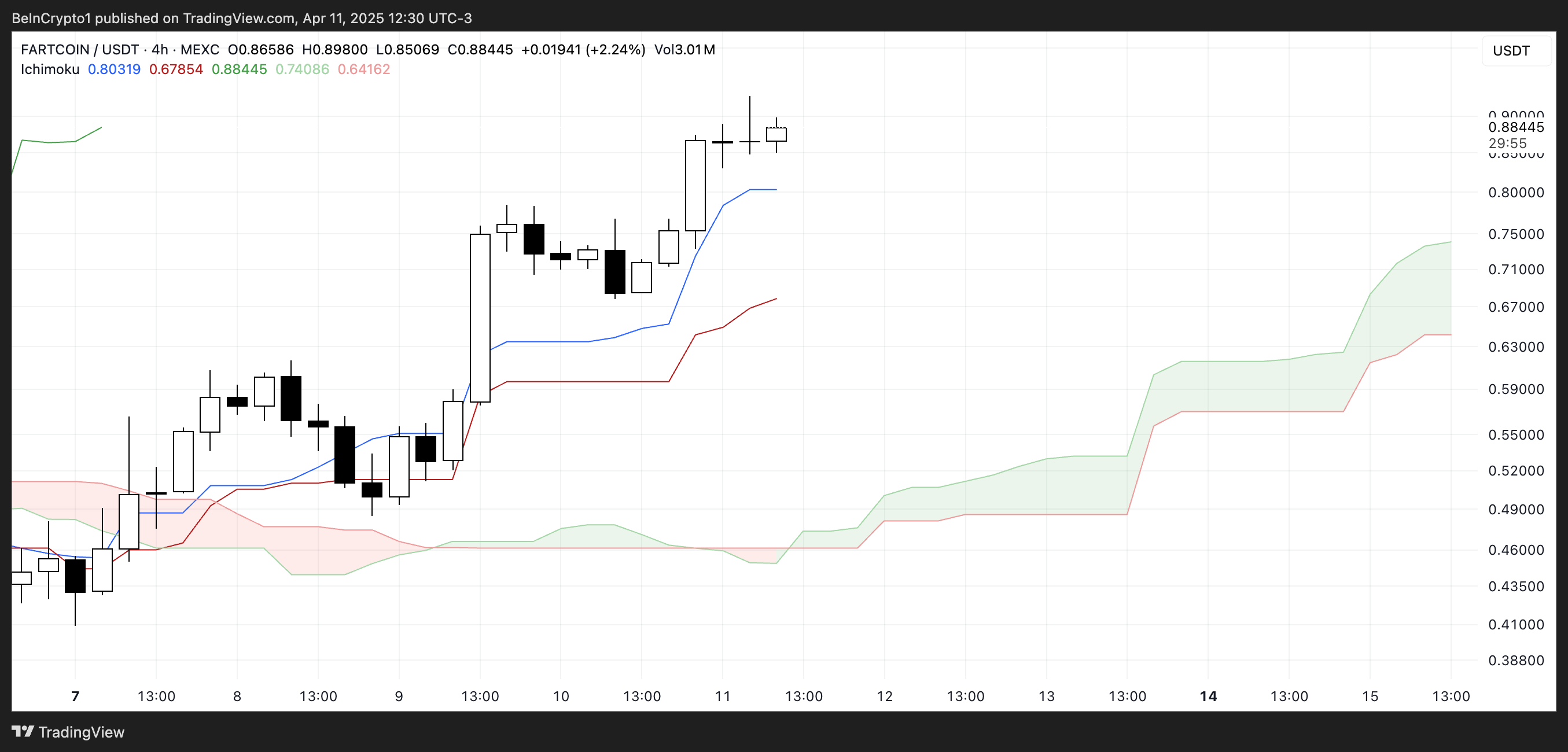 يظهر مخطط سحابة إيشيموكو لـ FARTCOIN حاليًا إعدادًا صعوديًا قويًا. مع اقتراب قيمتها السوقية من ٩٠٠ مليون دولار، فهي أكبر عملة ميمية تم إطلاقها على PumpFun.