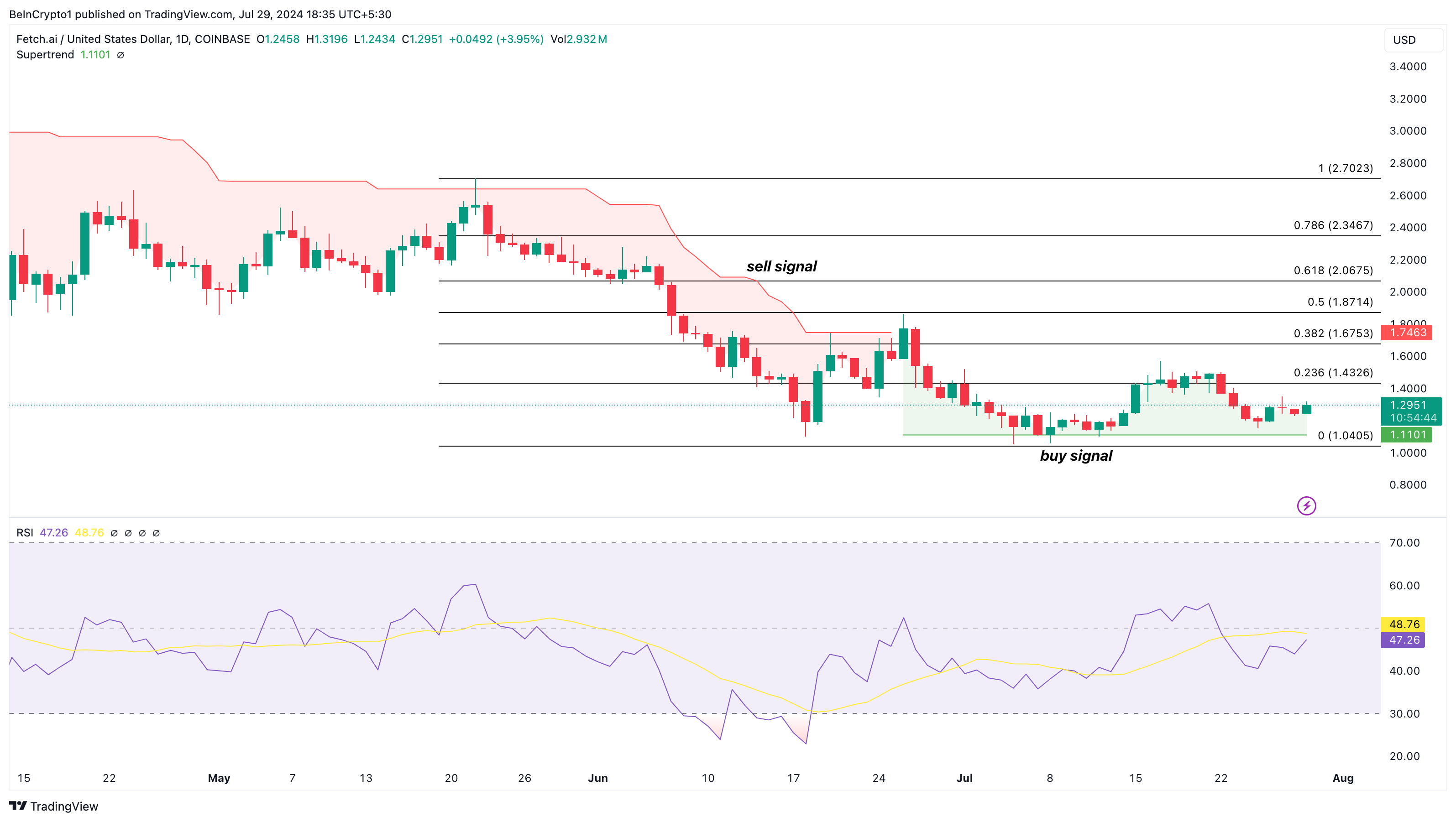 وقت كتابة هذا التقرير، يتداول FET بسعر 1,29 دولار، ويظهر مؤشر السوبرترند أن الرمز قد قدم إشارة شراء عند 1,11 دولار. يقوم مؤشر السوبرترند بتحليل حركة السعر في اتجاه هبوطي أو صاعد.