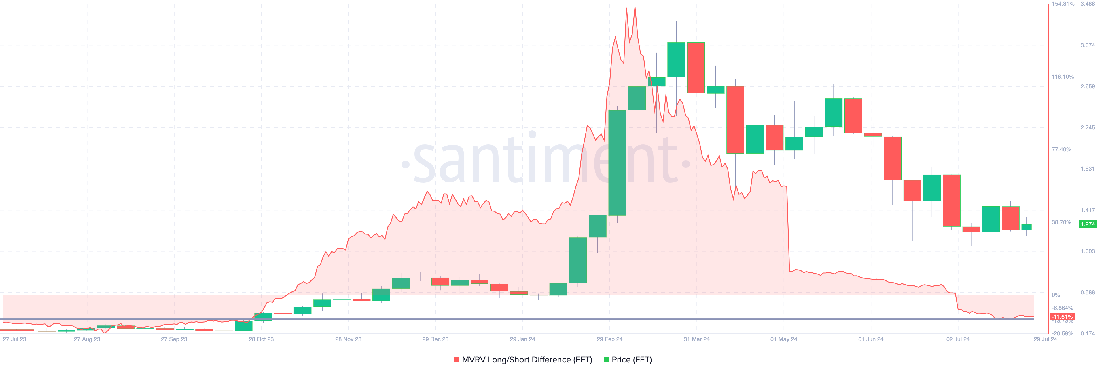 وفقًا لـ Santiment، فإن قيمة سوق FET إلى القيمة المحققة (MVRV) الفرق طويل/قصير الأجل هو -11,61%. يظهر هذا الفرق ما إذا كان حاملو الأجل الطويل سيحققون أرباحًا أكثر من حاملي الأجل القصير.