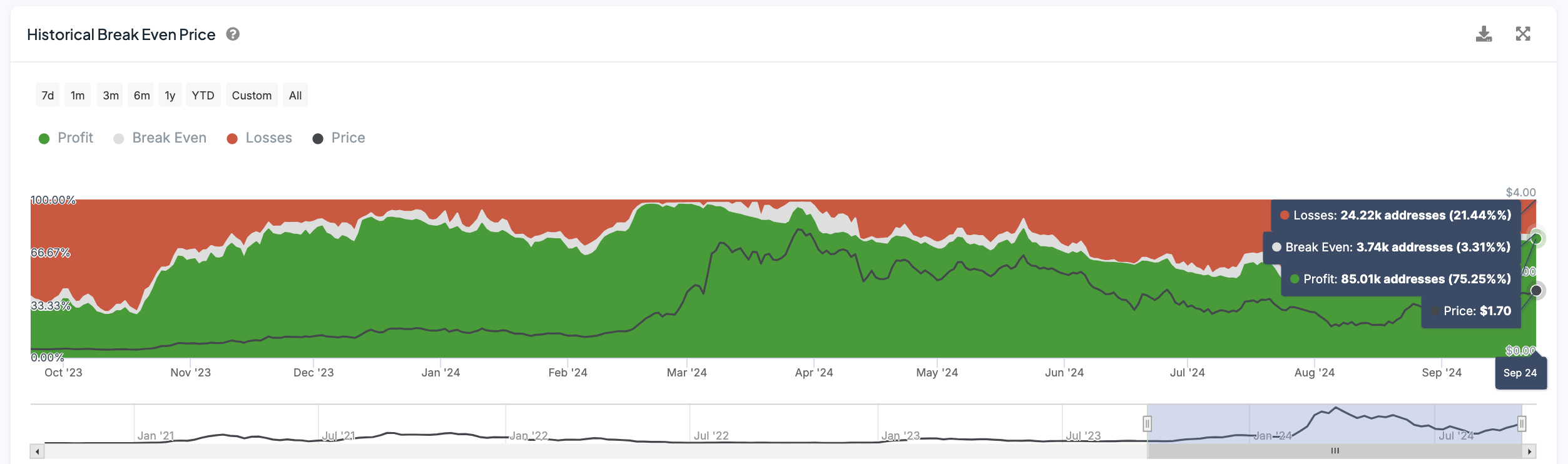 في الوقت الحالي، حوالي 75,25% من عناوين FET تحقق أرباحًا، مما يعني أن حوالي 85 010 عناوين تشهد مكاسب بالسعر الحالي البالغ 1,70 دولار. في الوقت نفسه، حوالي 21,44%، أو 24 220 عنوانًا، تتكبد خسائر، ونسبة صغيرة، 3,31%، أو 3 740 عنوانًا، عند نقطة التعادل.