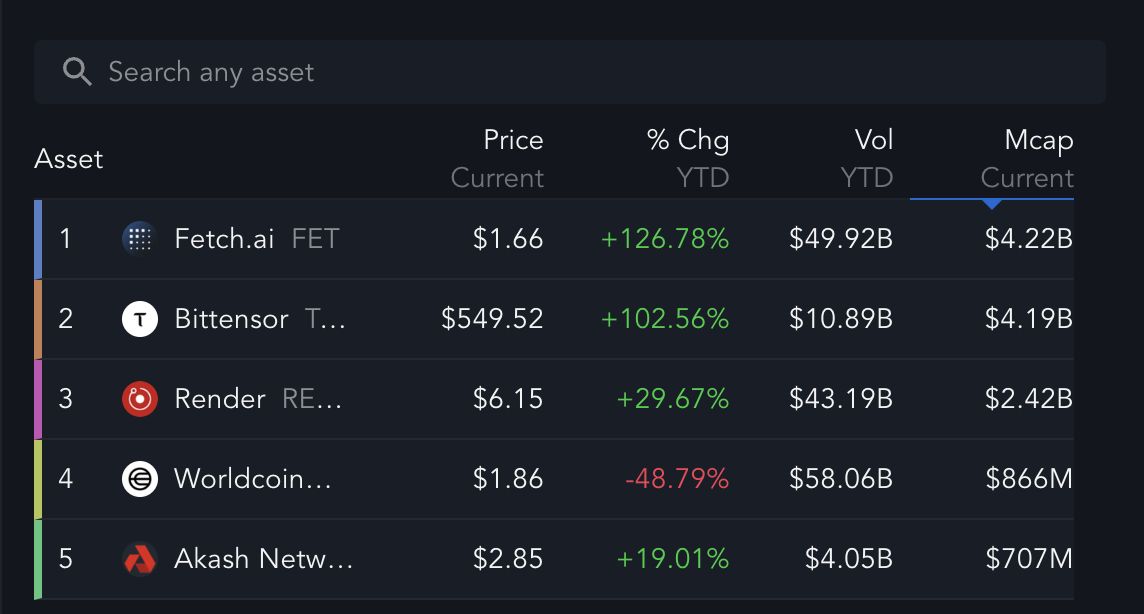 بينما يتبع Bittensor عن كثب بقيمة سوقية تبلغ 4,19 مليار دولار، تصبح قيادة FET أكثر وضوحًا عند مقارنتها ببقية المجموعة. مجتمعة، لا تصل Render وWorldcoin وAkash Network حتى إلى قيمة سوقية لـ FET.