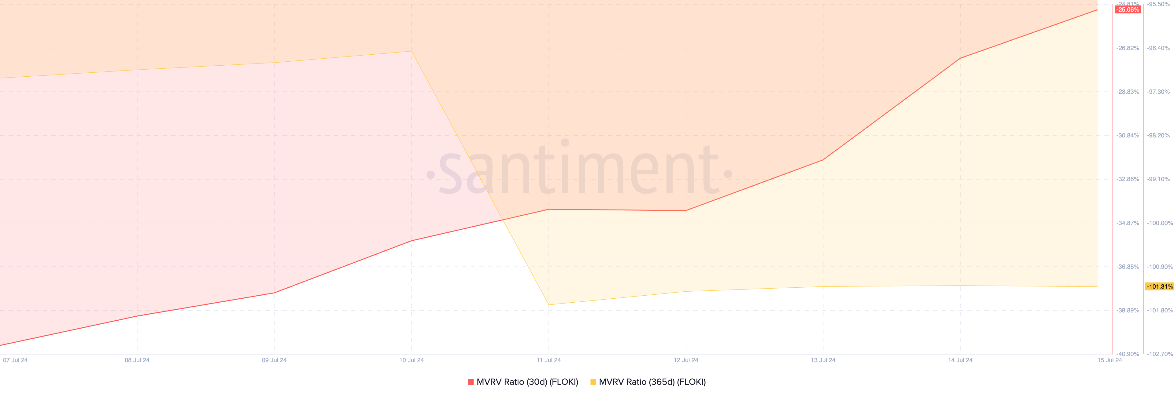 تظهر نسبة MVRV الخاصة بالرمز المميز قيما سالبة عند تقييمها على متوسطات متحركة مختلفة. على وجه التحديد ، كانت نسب MVRV الخاصة ب FLOKI للمتوسطين المتحركين لمدة 30 يوما و 90 يوما -25.06٪ و -101.31٪ على التوالي في وقت كتابة هذا التقرير.
