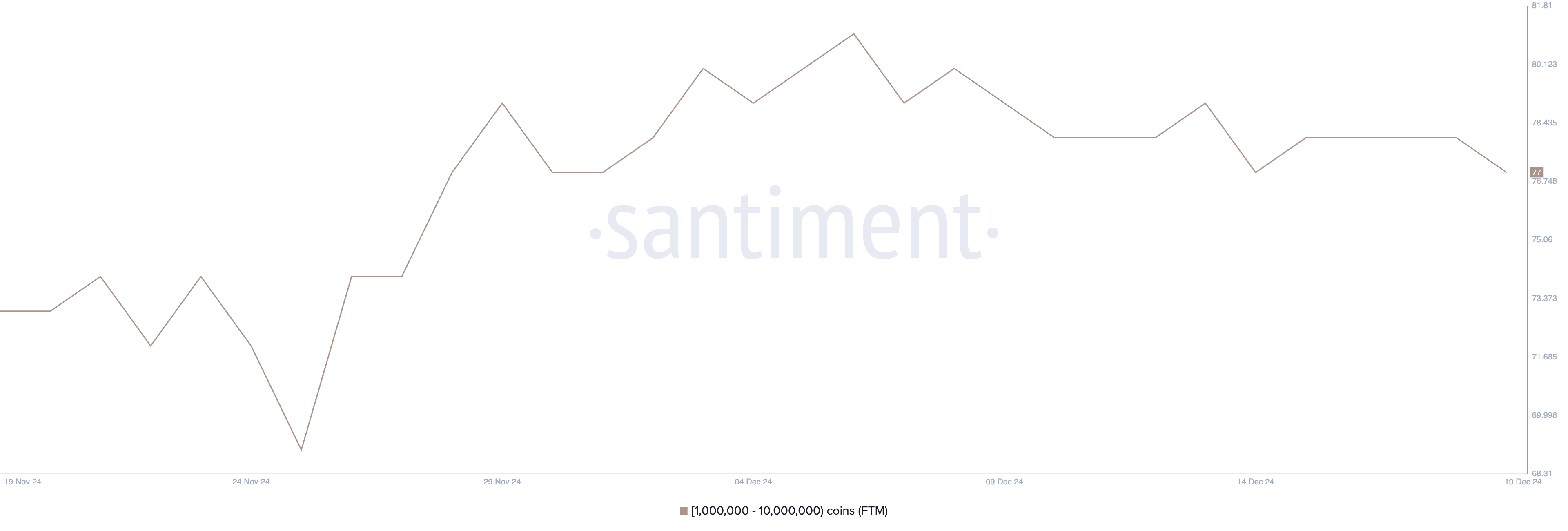 انخفض عدد المحافظ التي تحتوي بين 1 مليون و10 ملايين FTM إلى 77، مسجلًا أدنى مستوى له منذ 1 ديسمبر. تتبع هذه المحافظ، التي يشار إليها غالبًا باسم "الحيتان"، أمر حاسم لأنها يمكن أن تؤثر بشكل كبير على السوق بسبب الحجم الكبير من الرموز التي تتحكم فيها.