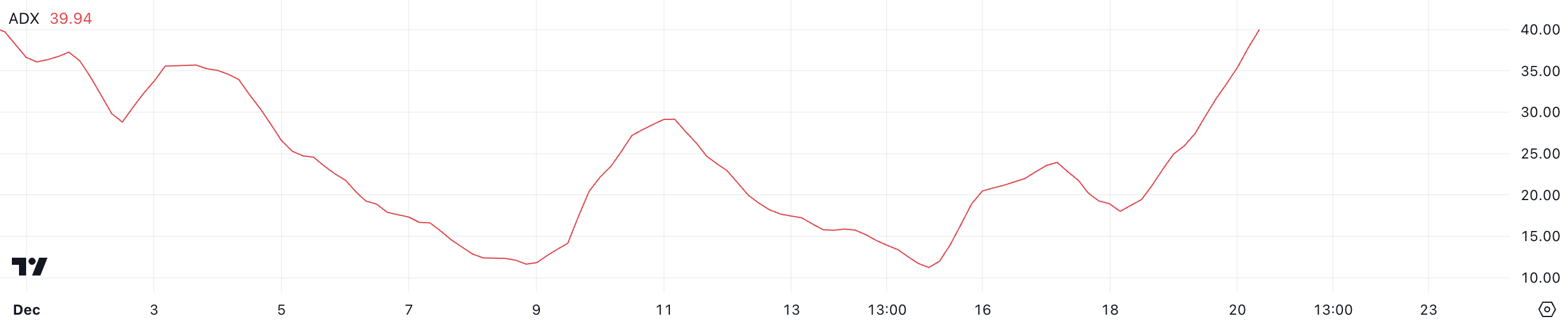 يقيس ADX قوة الاتجاه، بغض النظر عن اتجاهه، على مقياس من 0 إلى 100. القيم أقل من 20 تشير إلى اتجاه ضعيف أو بدون اتجاه، القيم بين 20 و40 تشير إلى اتجاه معتدل، والقيم فوق 40 تعكس اتجاهًا قويًا.