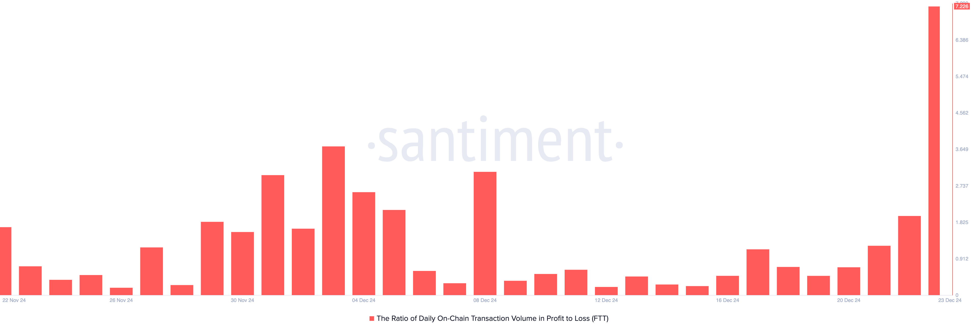 وفقًا لـ Samtiment، يقف هذا حاليًا عند 7,22. يعني هذا أنه مقابل كل معاملة FTT انتهت بخسارة اليوم، هناك 7,22 معاملة حققت ربحًا.