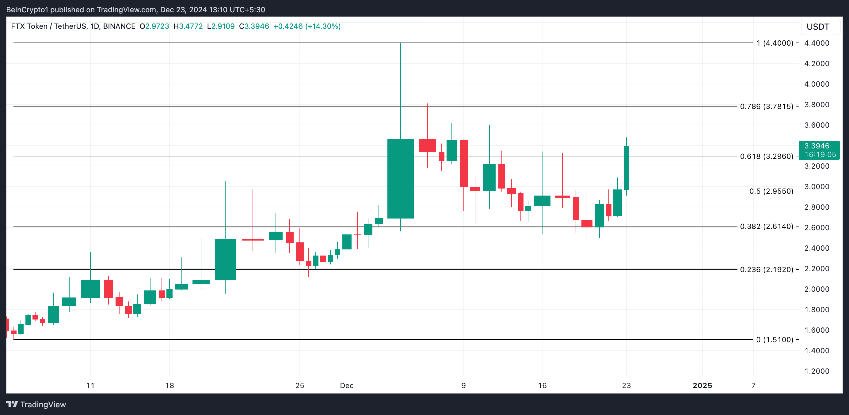 Sponsoredمع بقاء أقل من 10 أيام حتى هذا التاريخ، بدأت الأنشطة التجارية حول FTT في الارتفاع. حتى كتابة هذه السطور، يتم تداول العملة البديلة بسعر $3,21، مرتفعة بنسبة 14% خلال الـ 24 ساعة الماضية. جعلها هذا الارتفاع ذو الرقمين الرابح الأكبر في السوق خلال تلك الفترة.