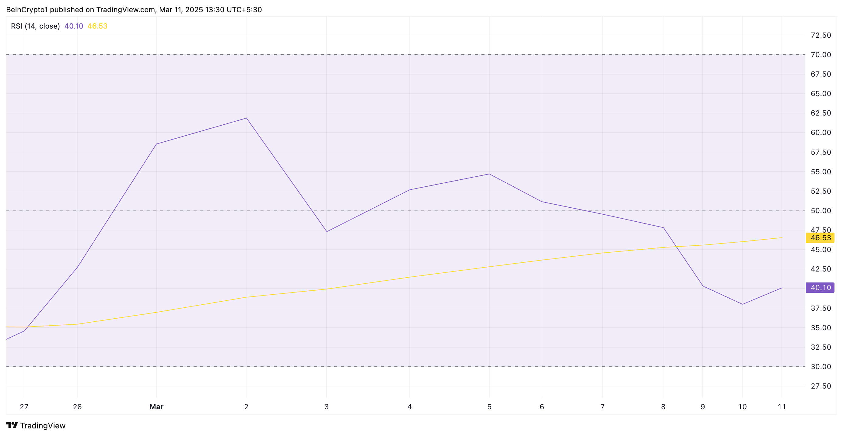 كما انخفض مؤشر القوة النسبية (RSI) لـ HBAR، مما يؤكد زيادة ضغط البيع حيث يسحب المستثمرون الأموال من السوق. في وقت كتابة هذا التقرير، كان هذا المؤشر، الذي يقيس ظروف السوق المبالغ في بيعها وشرائها، عند 40,10.