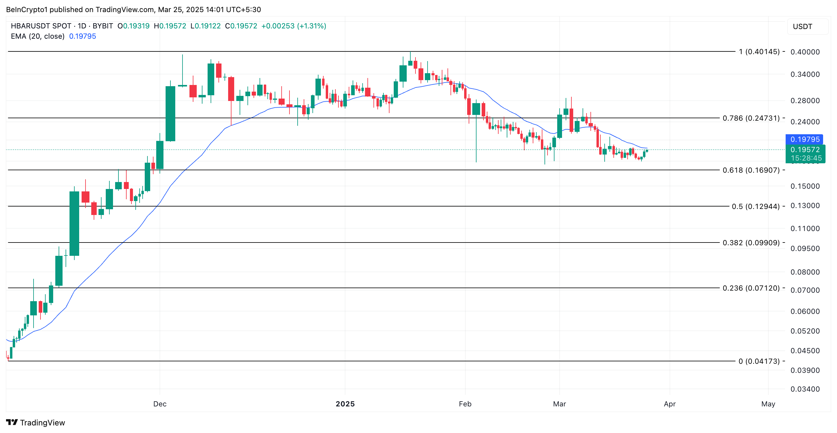 اختراق HBAR فوق المتوسط المتحرك الأسي لـ20 يومًا يمكن أن يعزز الضغط الصعودي في السوق ويحفز ارتفاعًا ممتدًا. في هذا السيناريو، يمكن أن يرتفع سعر الرمز إلى 0,24 دولار، مما يمثل زيادة بنسبة 26% من قيمته الحالية.