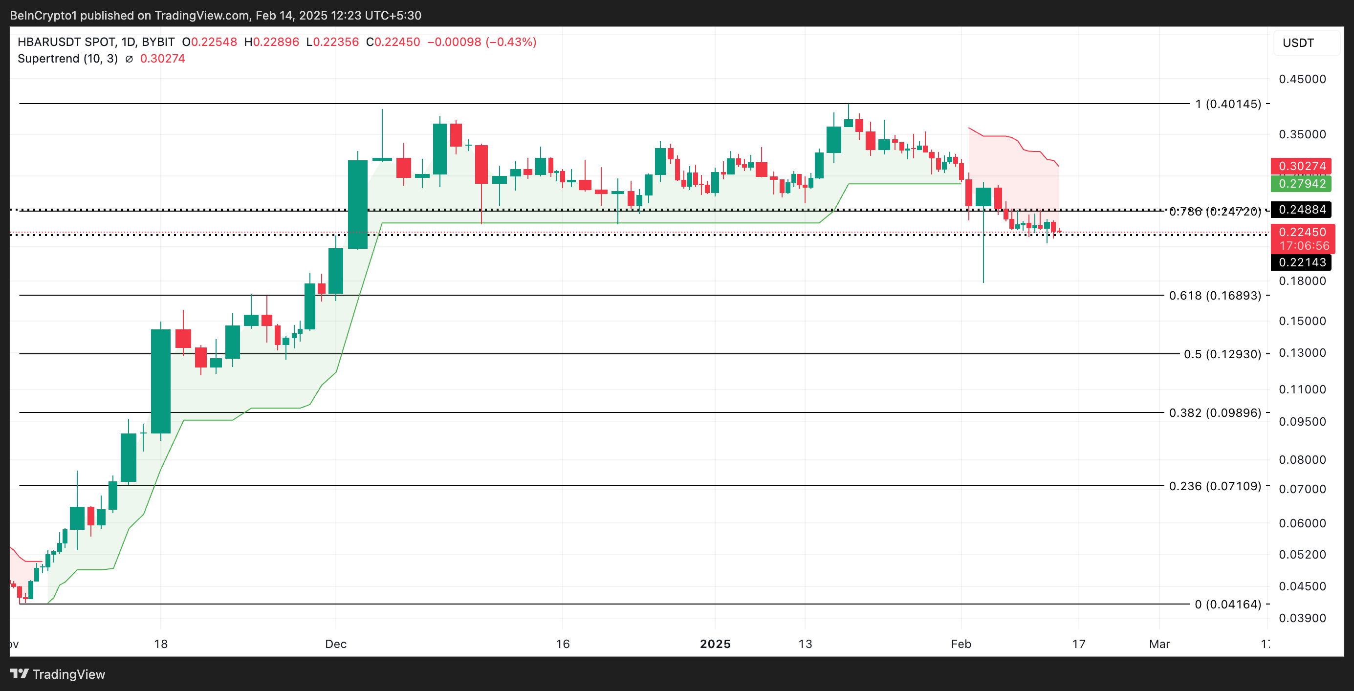 عندما يتداول الأصل تحت خط الاتجاه الفائق، يشير ذلك إلى اتجاه هبوطي، مما يدل على زخم هبوطي محتمل وضغط بيعي. إذا زادت عمليات البيع، يمكن أن يكسر سعر HBAR مستوى الدعم عند $0,22 وينخفض إلى $0,16.