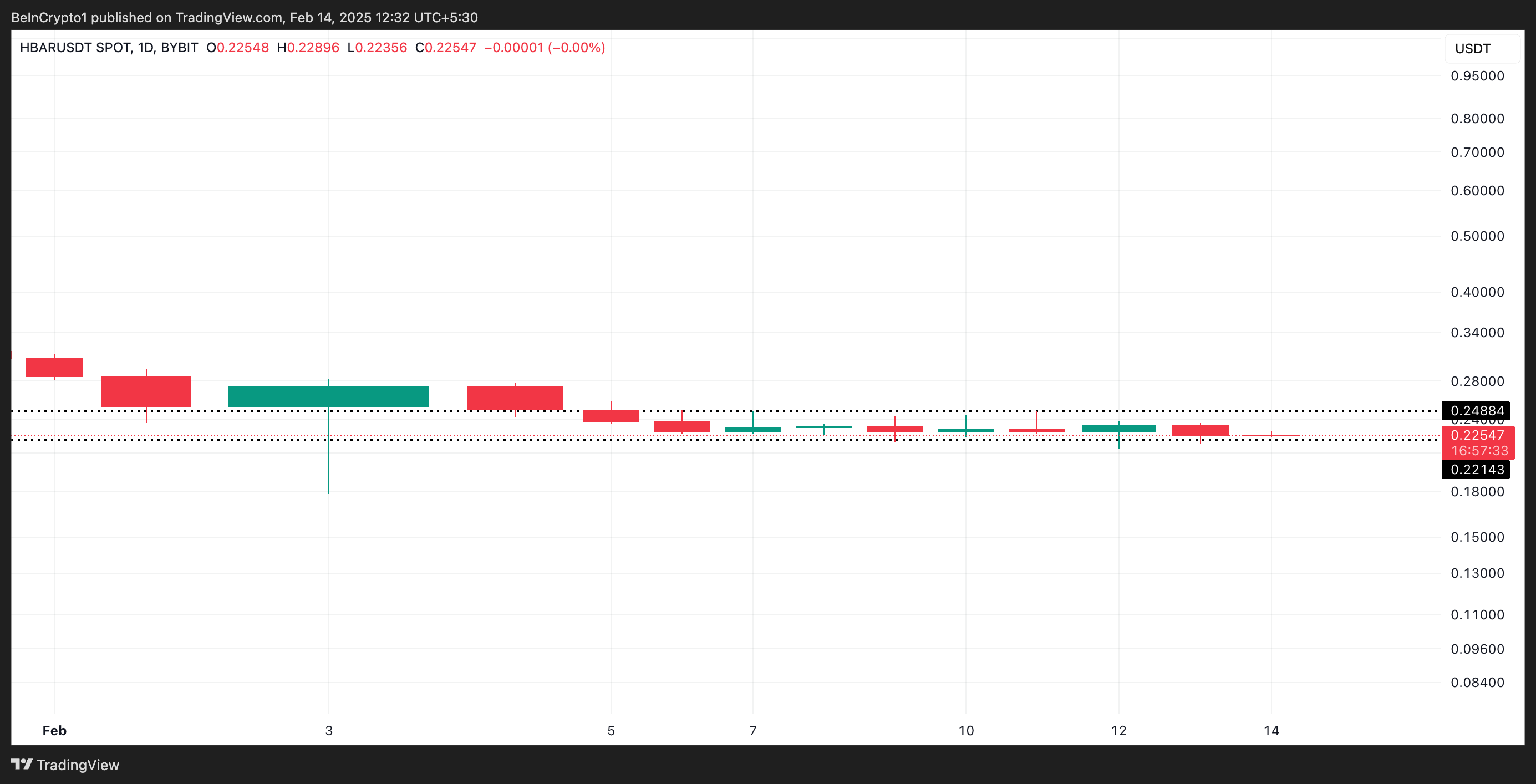 توحيد السوق الأوسع خلال الأسبوعين الماضيين وضع HBAR في مأزق. بقي سعره ضمن نطاق ضيق، يواجه مقاومة عند $0,24 بينما يجد دعمًا عند $0,22.