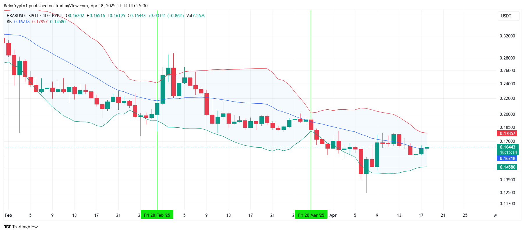 تشير نطاقات بولينجر لـ HBAR إلى زيادة في التقلبات في الأيام القادمة. النطاقات تغلق حاليًا، مما يسبق عادةً ضغطًا يتبعه حركة سعرية كبيرة في أي اتجاه، اعتمادًا على ظروف السوق.