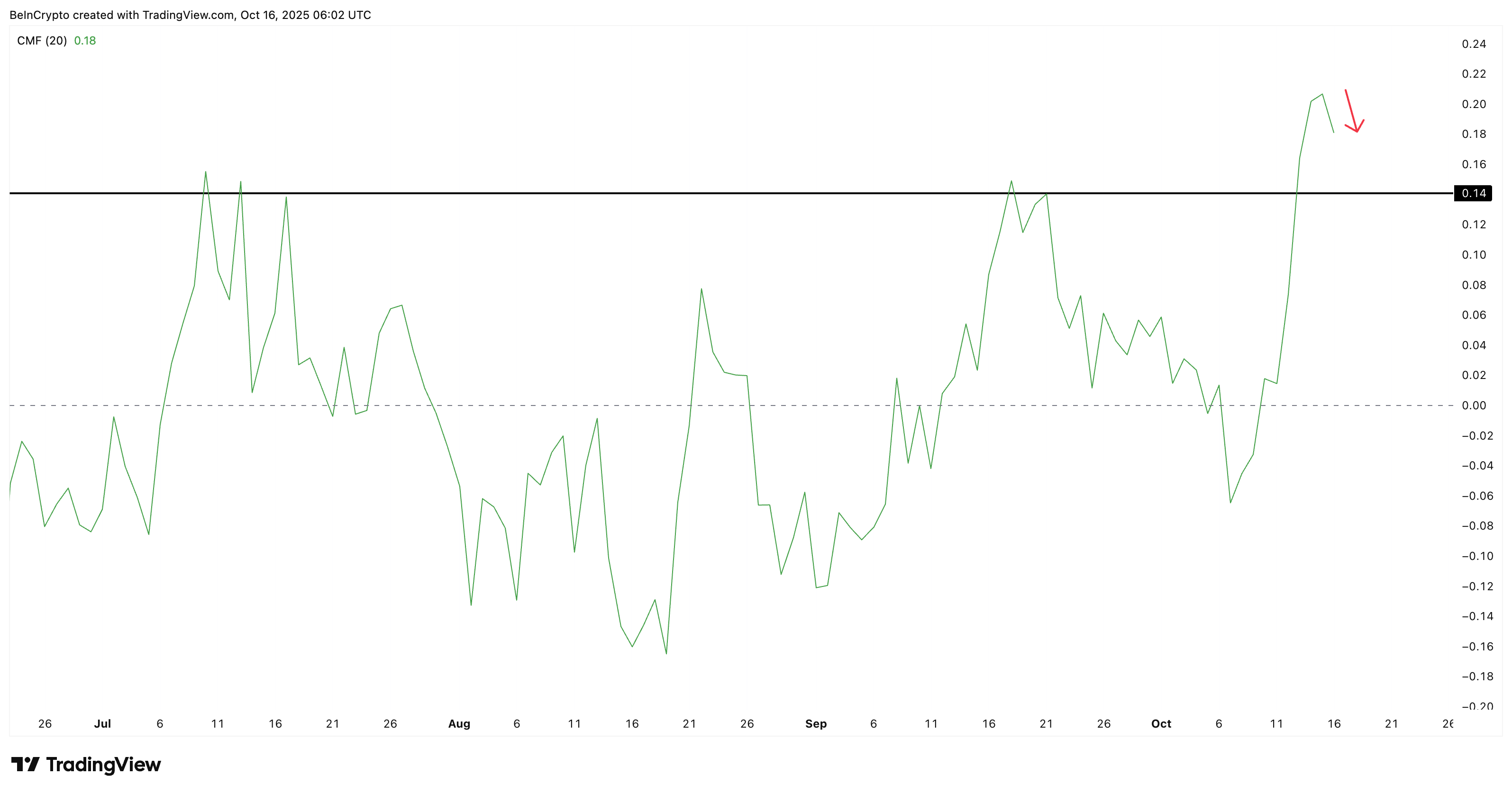 يجب على المتداولين مراقبة 0,14 على CMF كحد فاصل. إذا انخفض CMF تحت هذا الخط، فهذا يعني أن تدفق الأموال يجف.