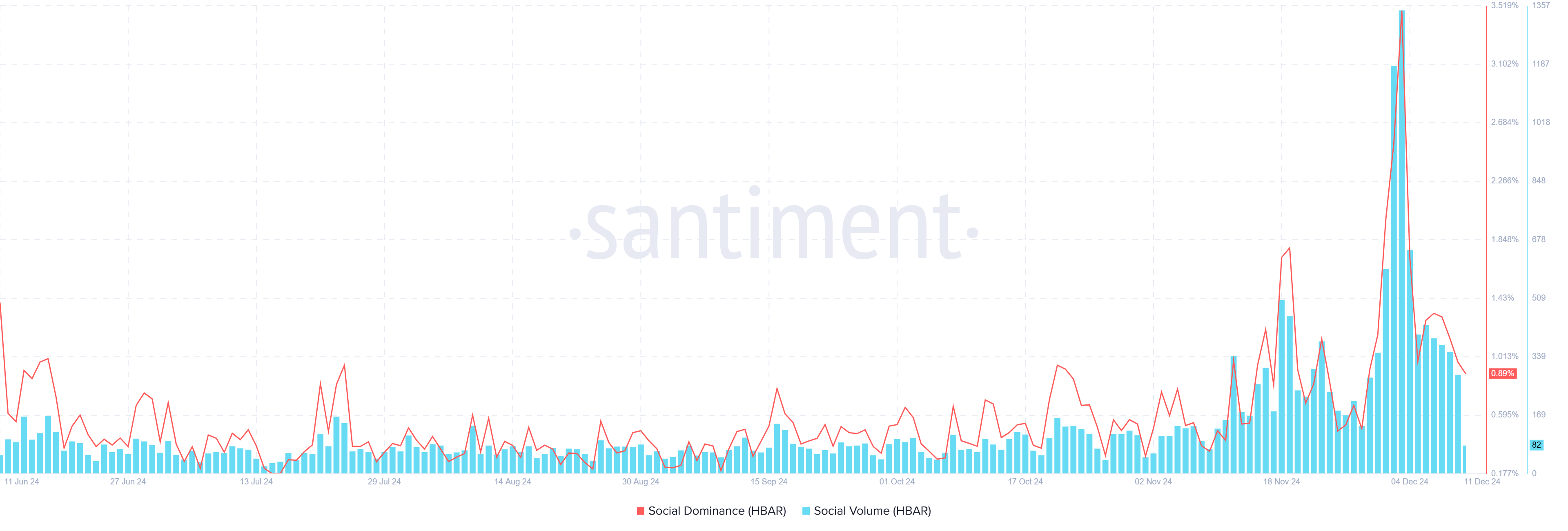 انخفضت الهيمنة الاجتماعية لعملة HBAR بشكل كبير في الأسابيع الأخيرة، مما قد يساهم في فقدان الرمز لاهتمام المستثمرين. في بداية ديسمبر، شهدت عملة HBAR ذروة في المناقشات على وسائل التواصل الاجتماعي، حيث وصلت هيمنتها إلى 3,84%.